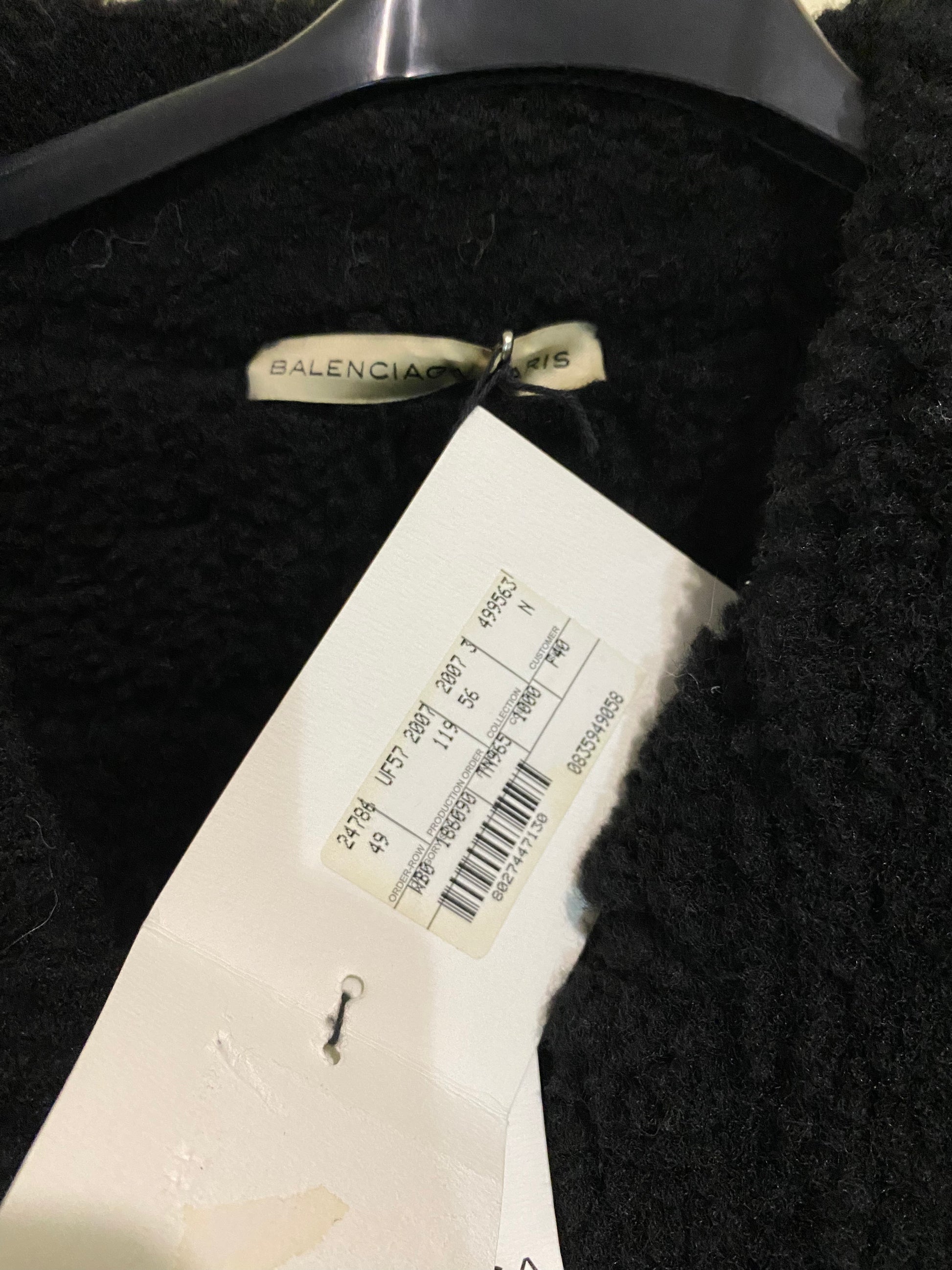 BALENCIAGA black shearling lined suede and leather 2007 runway corset coat, by Nicholas Ghesquière. It features black tonal leather panels, shearling collar and lining, an elastic waist with double belted detail and an exaggerated architectural hip for the ultimate corseted effect. A collector's one of a kind piece, this is a heavy jacket as well. Without a care label