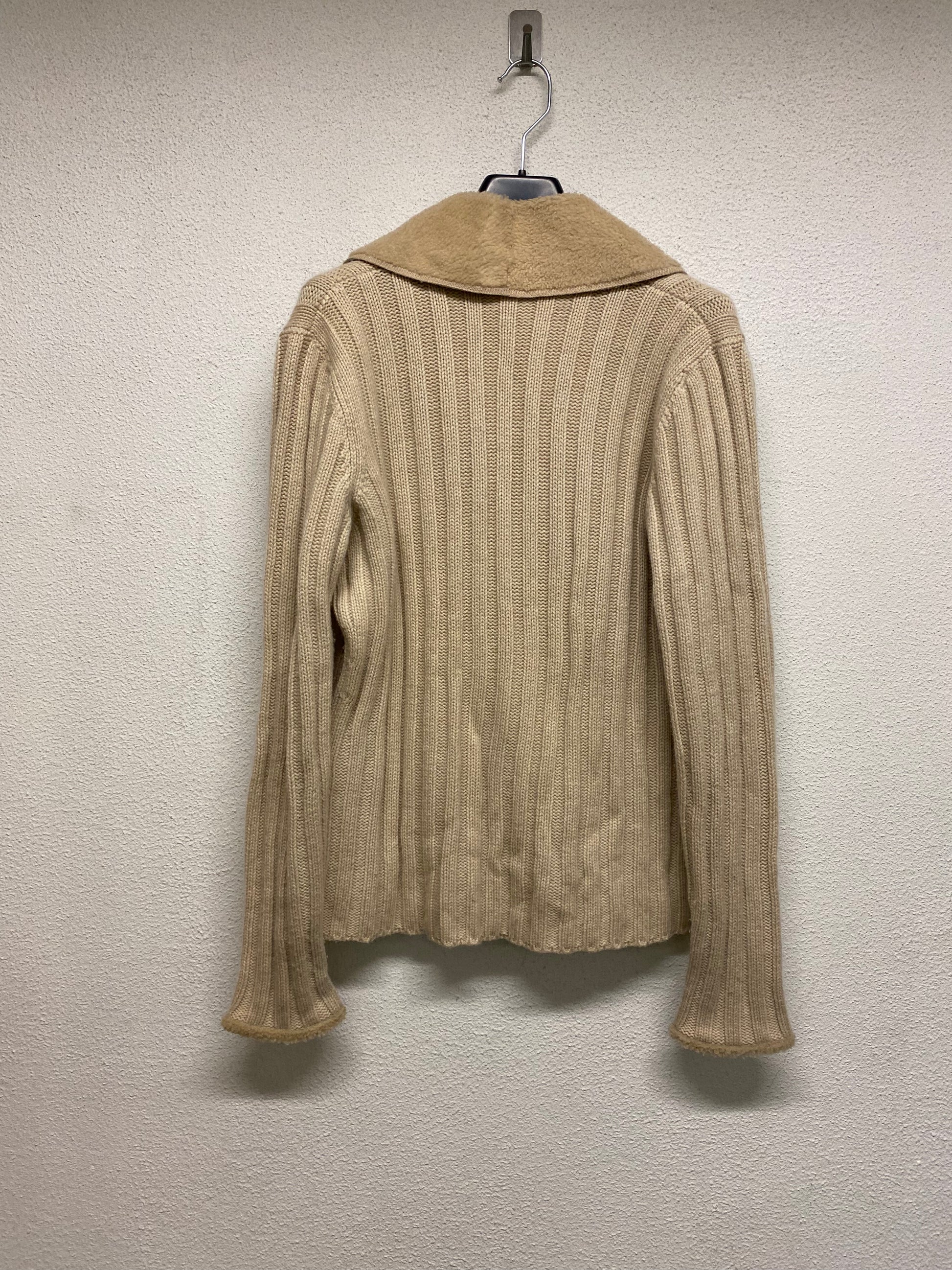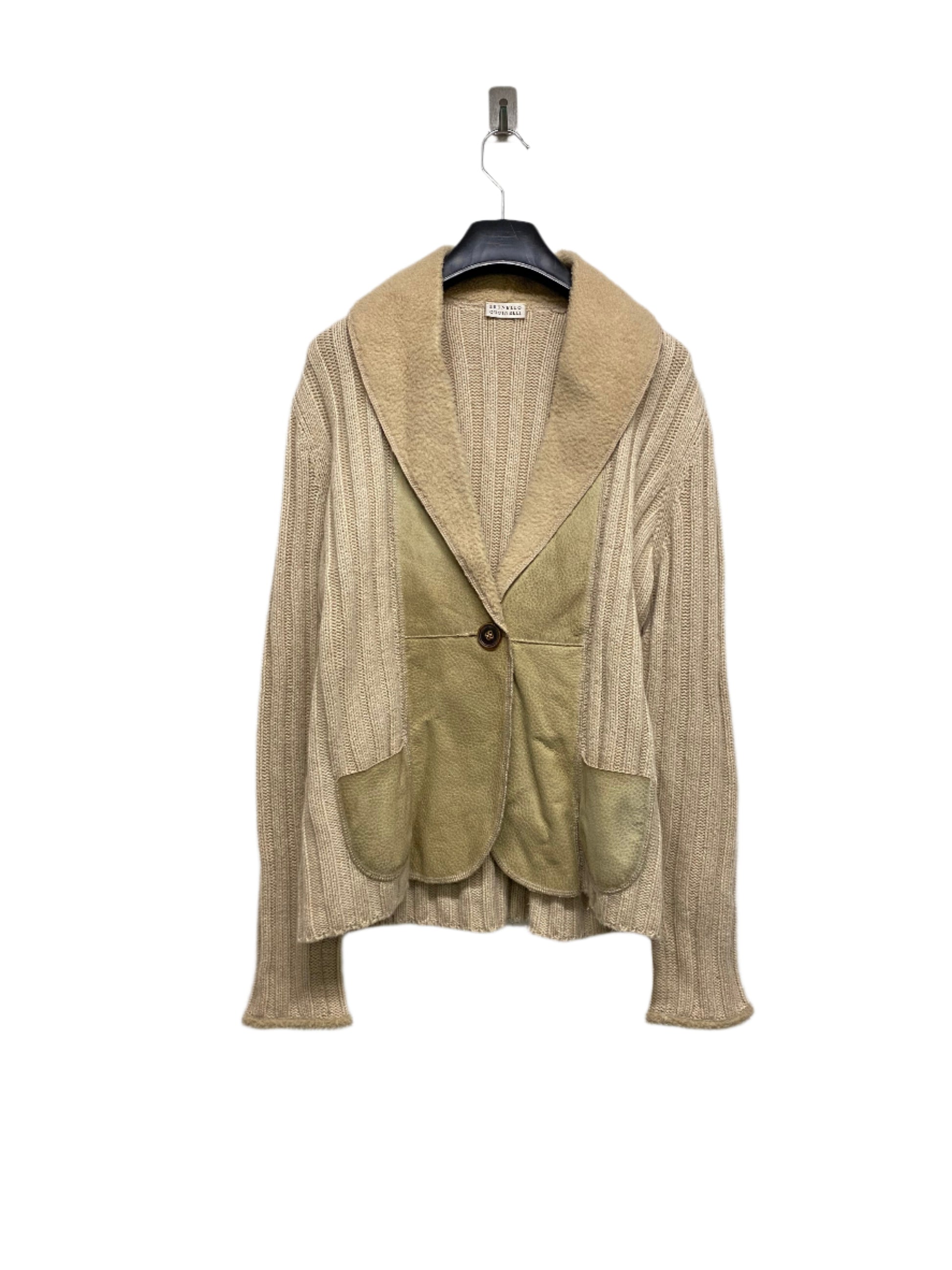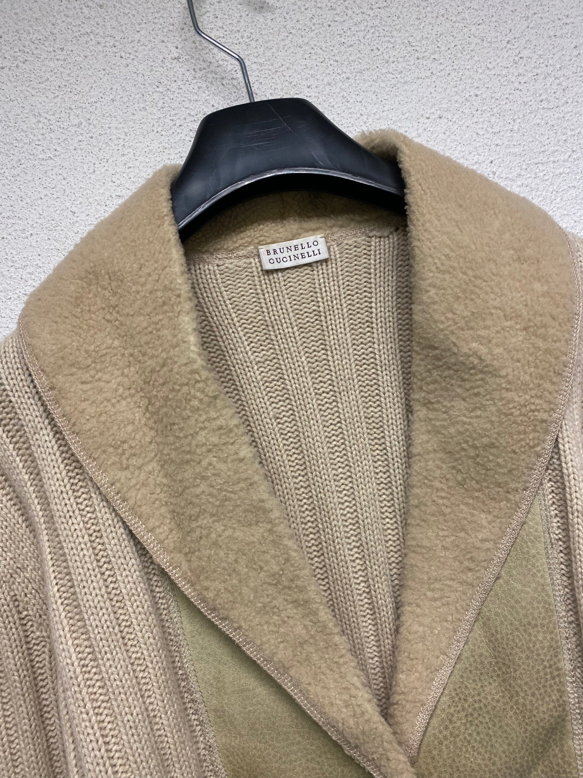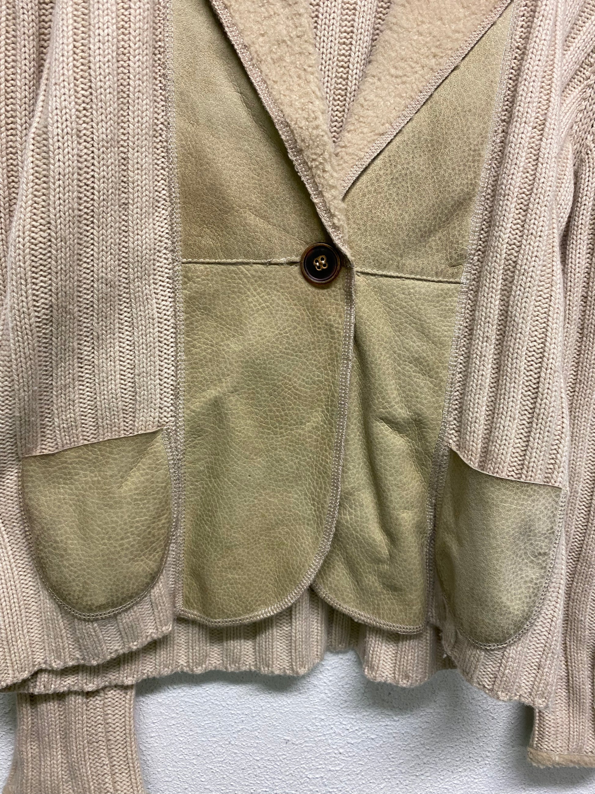 BRUNELLO CUCINELLI beige leather and cashmere one button shearling cardigan (M)