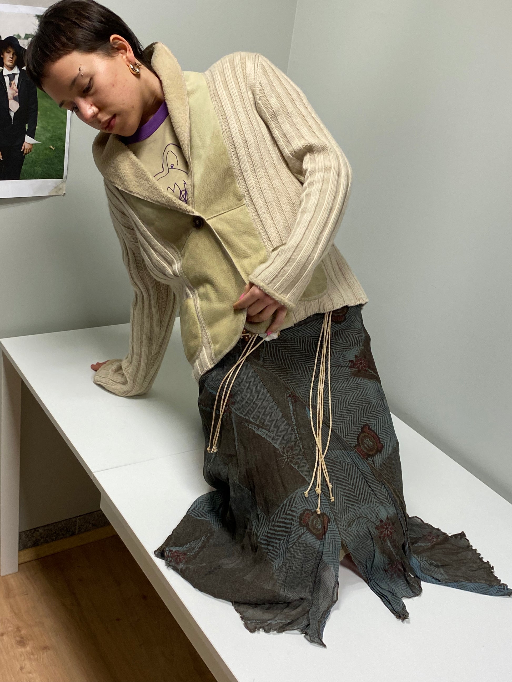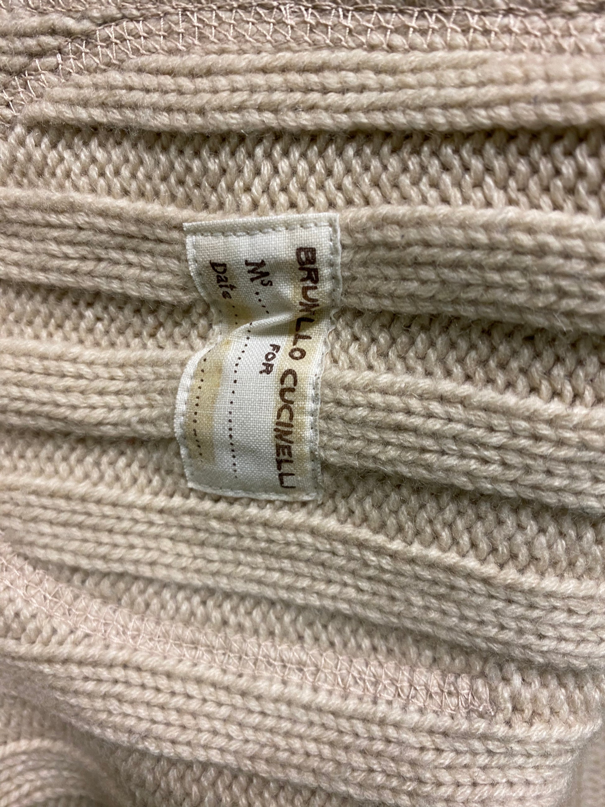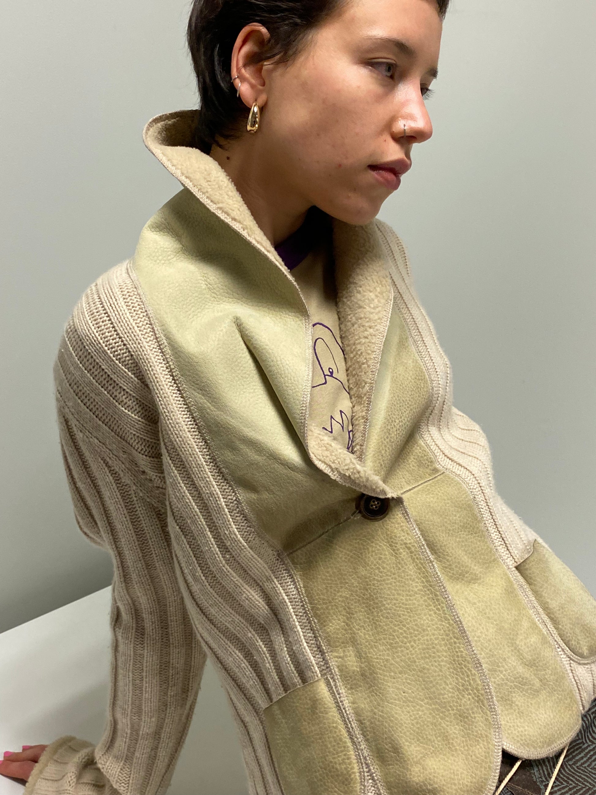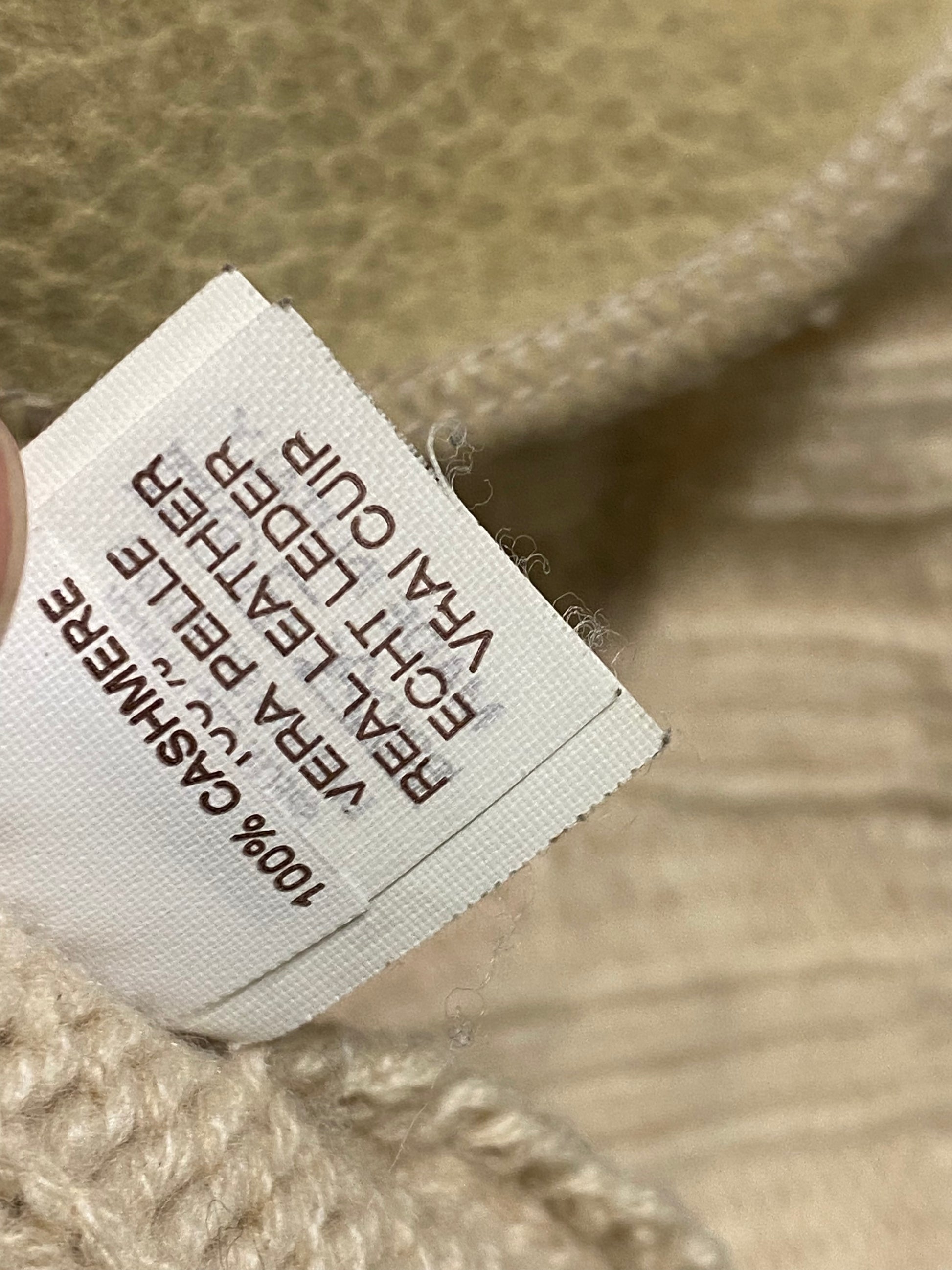 BRUNELLO CUCINELLI beige leather and cashmere one button shearling cardigan (M)