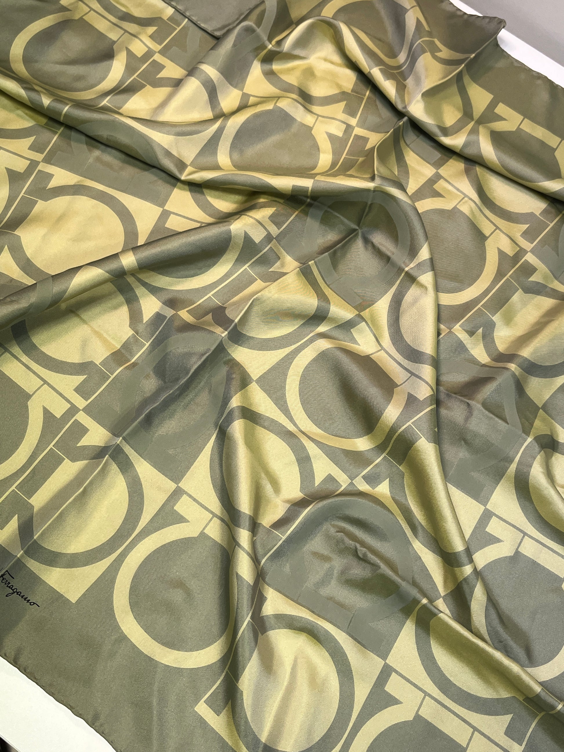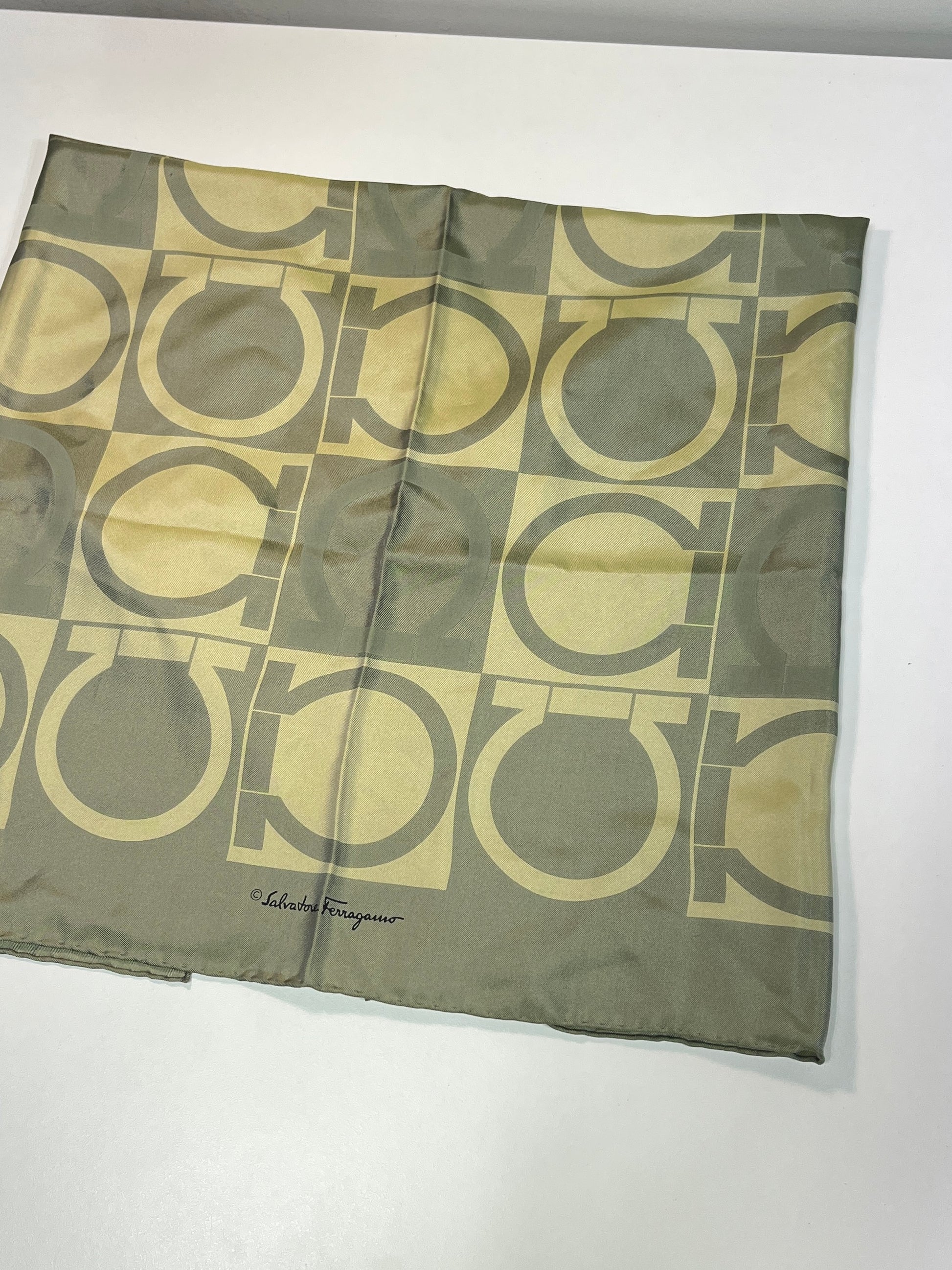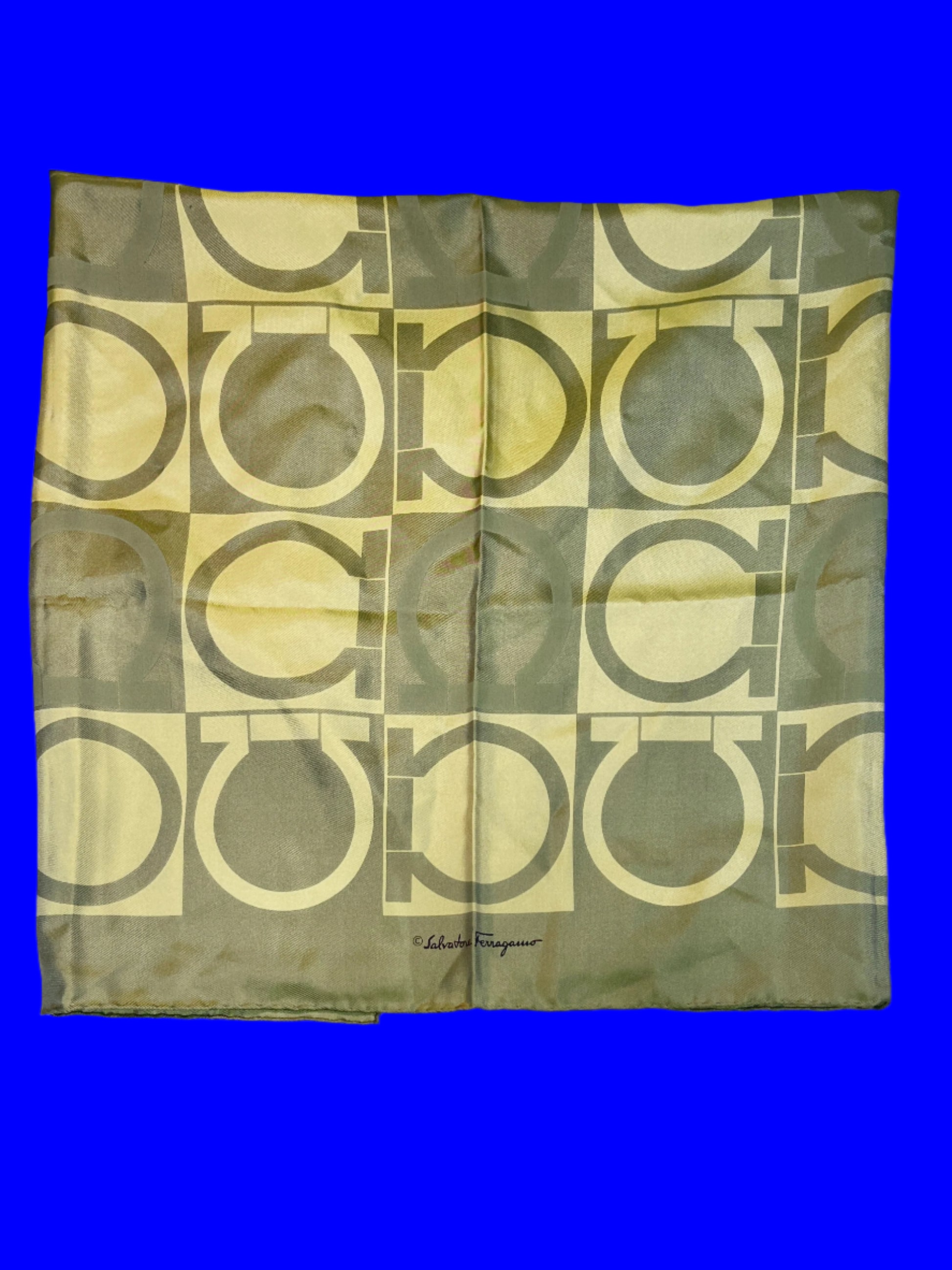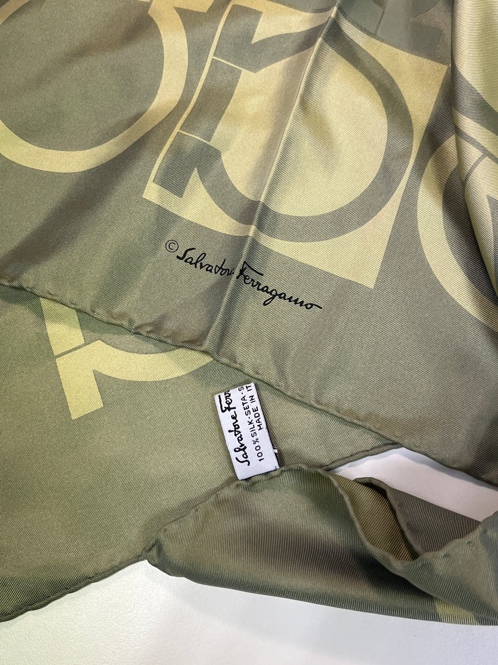 FERRAGAMO khaki monogram print 100% silk scarf / handkerchief