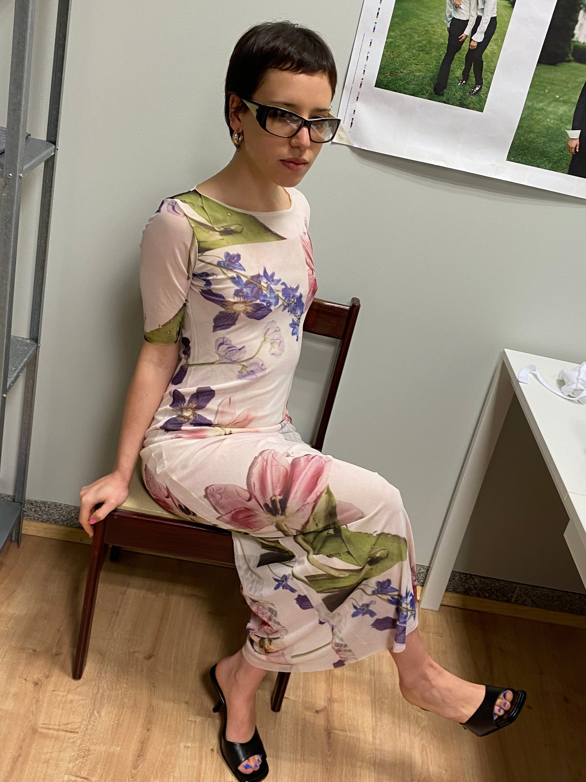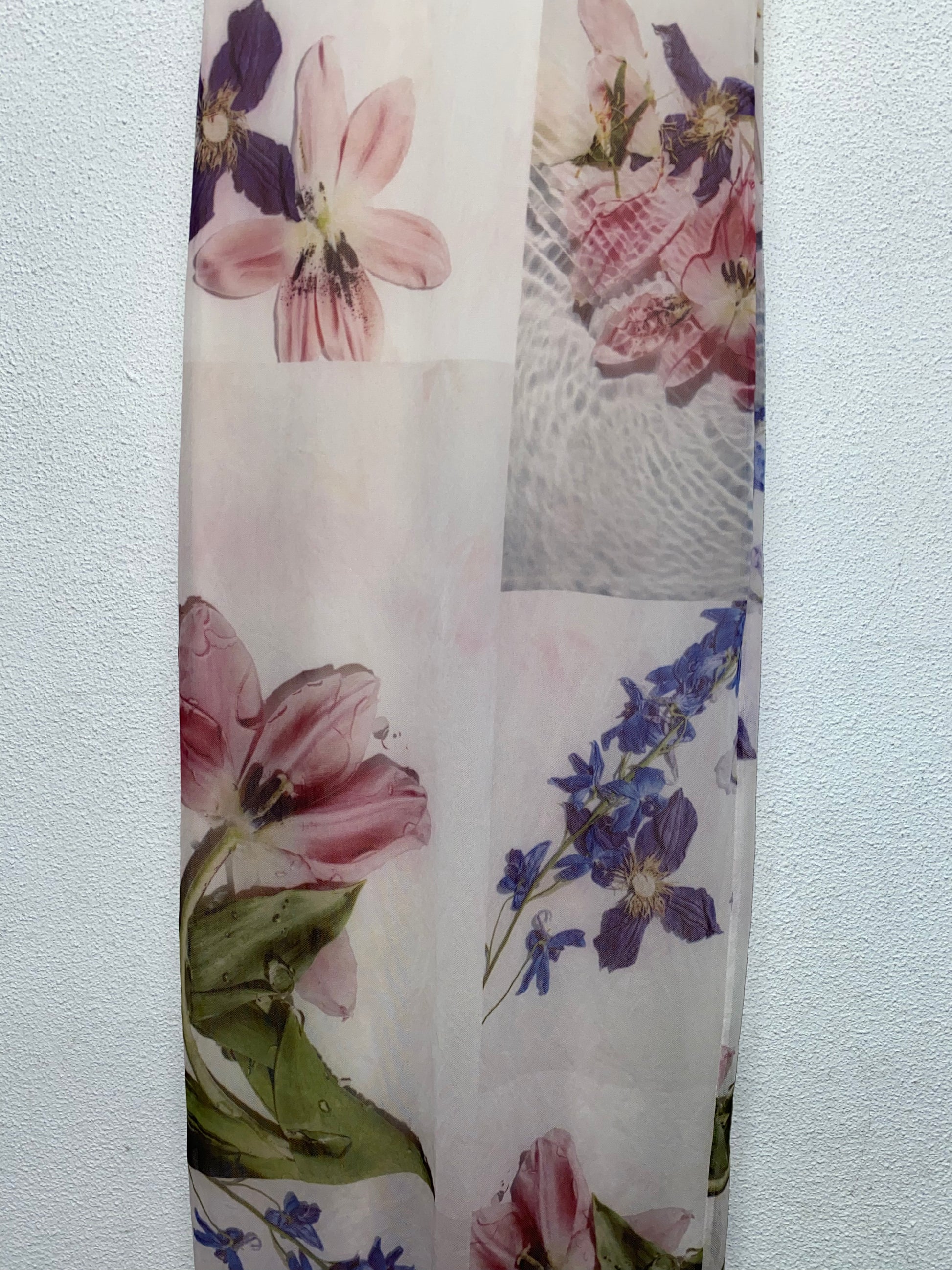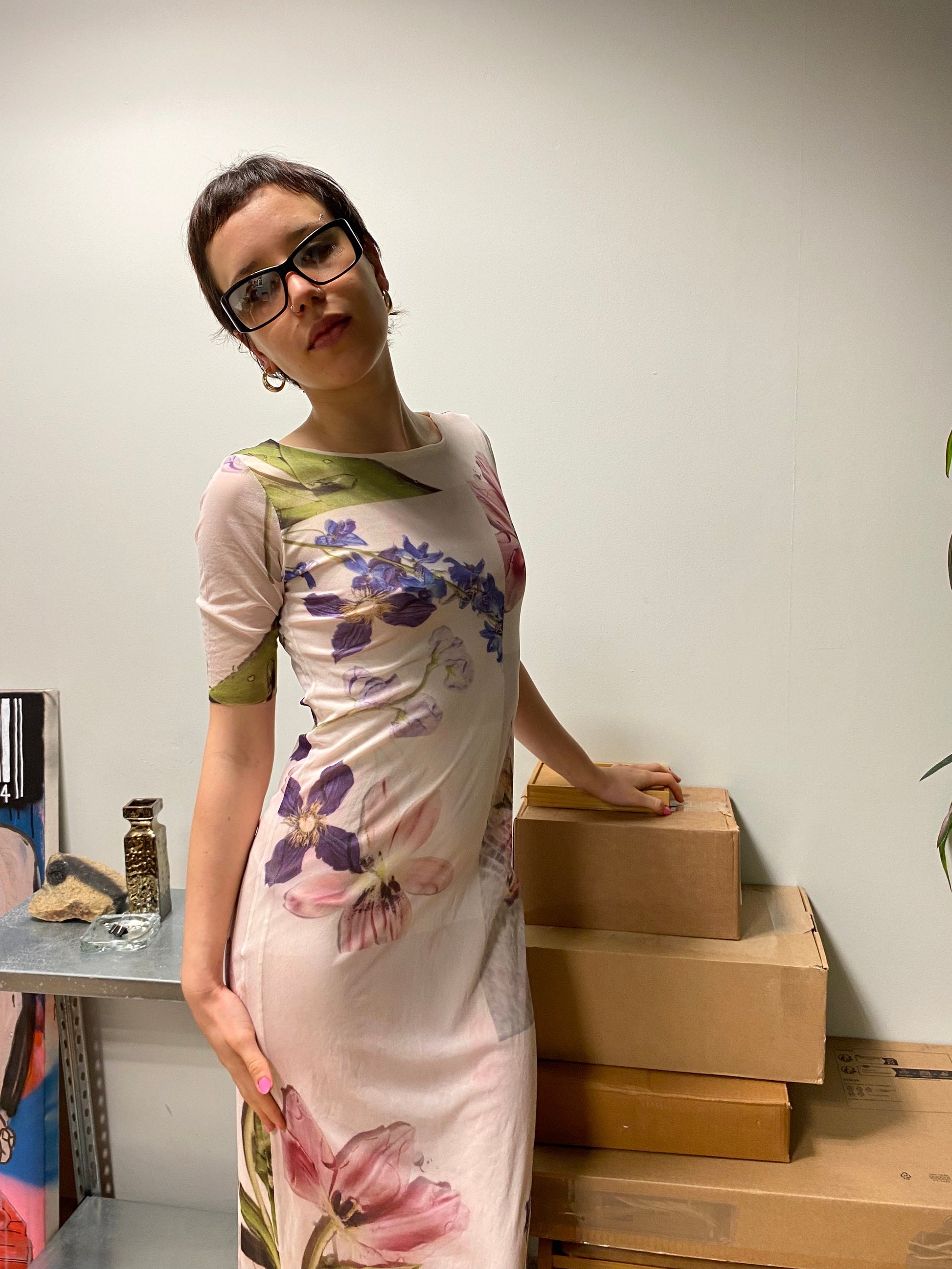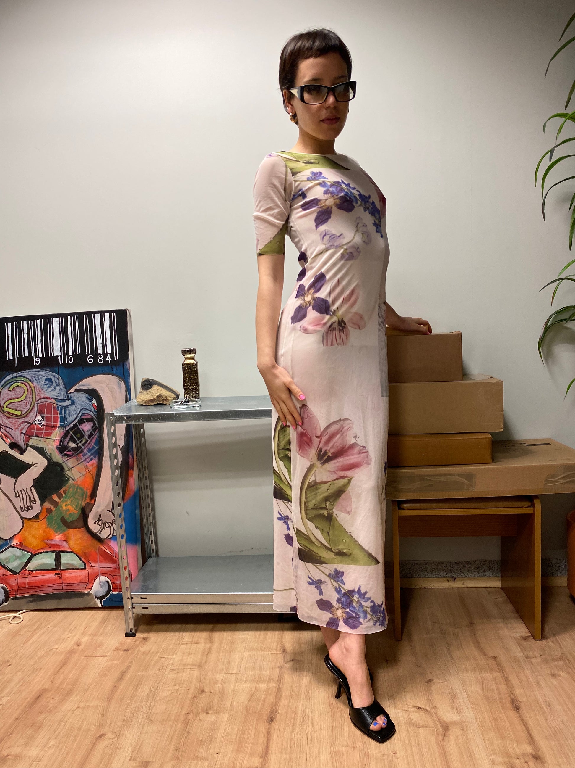 GANNI floral graphic maxi double layer mesh dress, stretchy fabric (S)