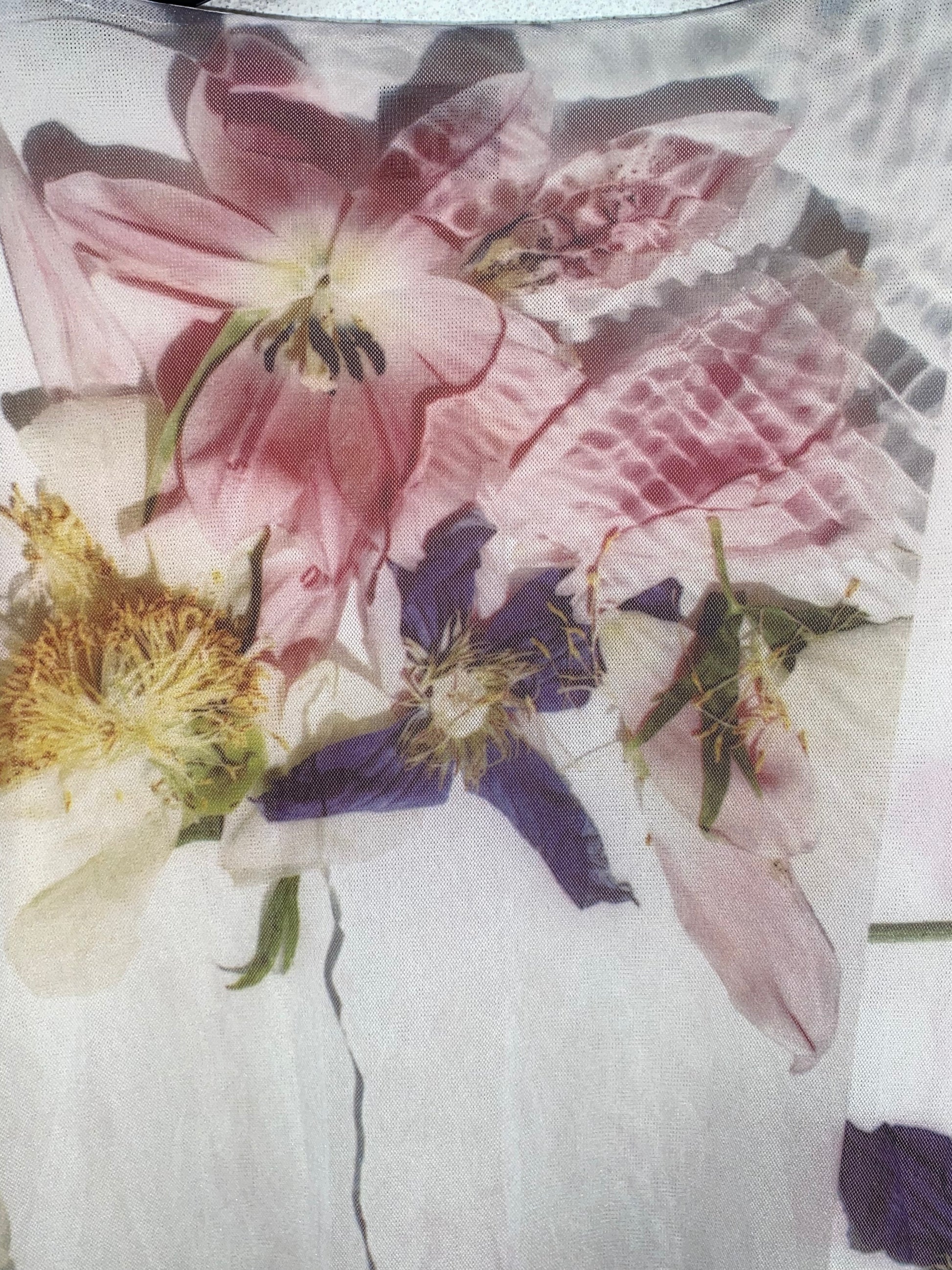 GANNI floral graphic maxi double layer mesh dress, stretchy fabric