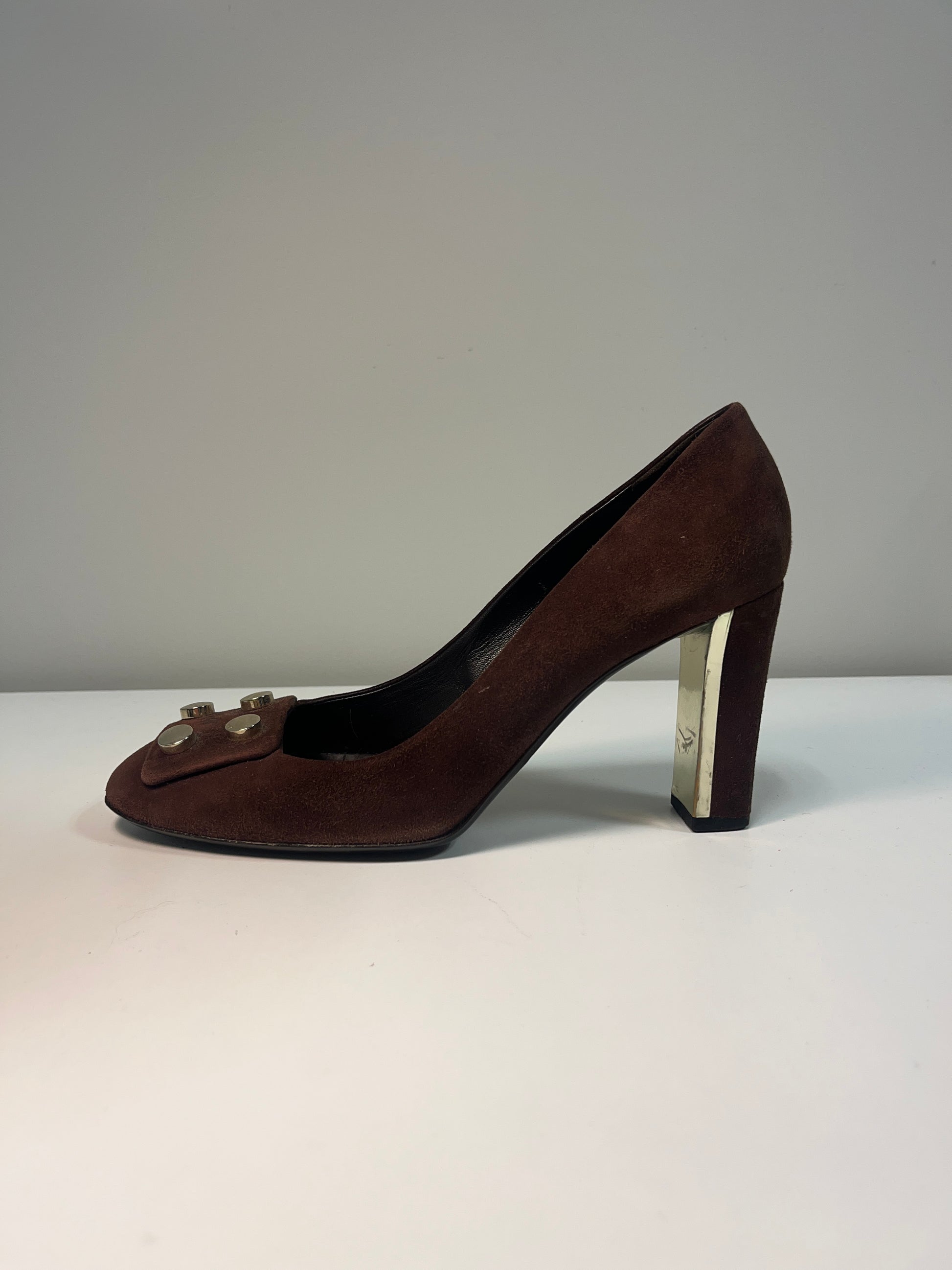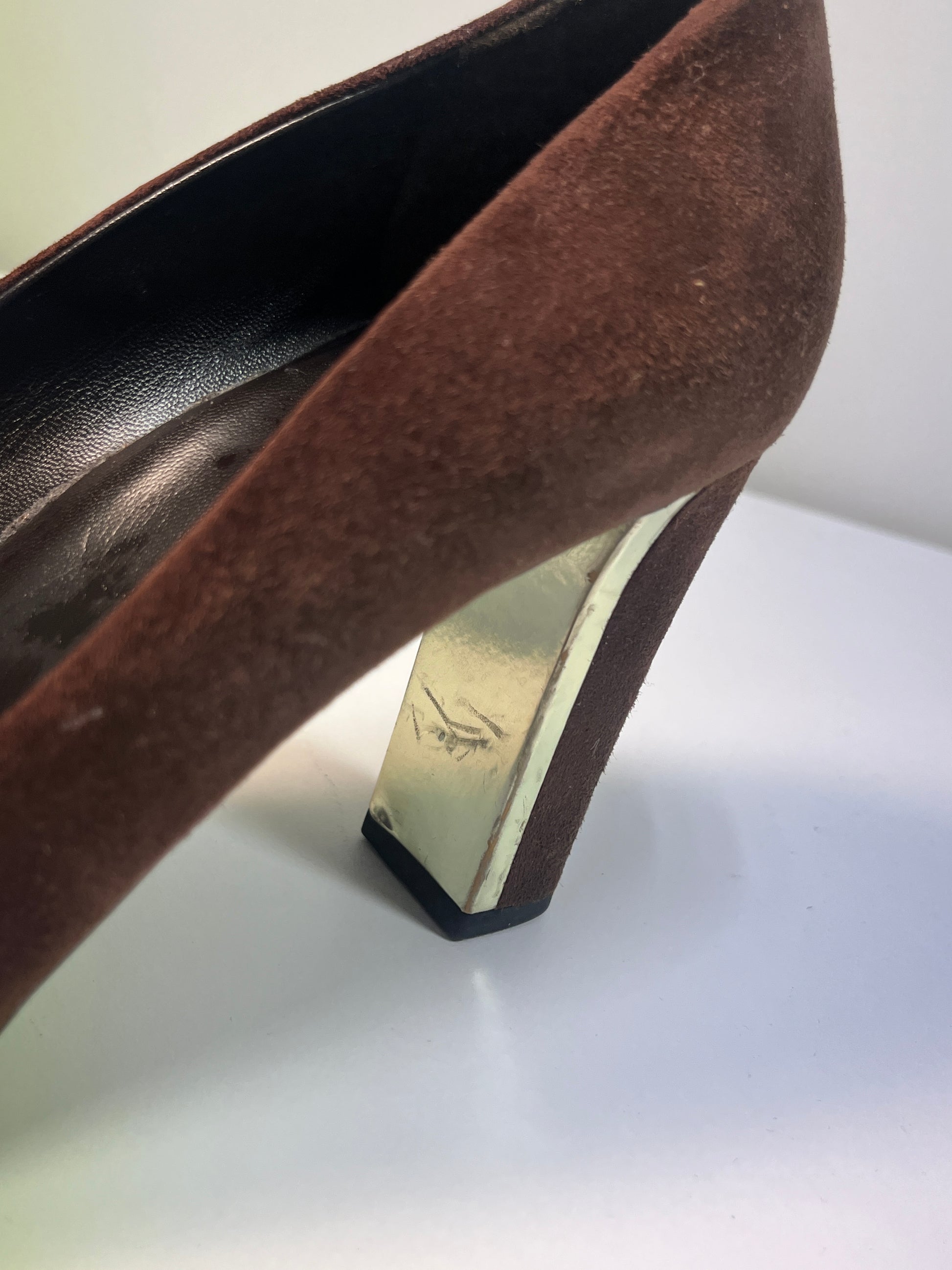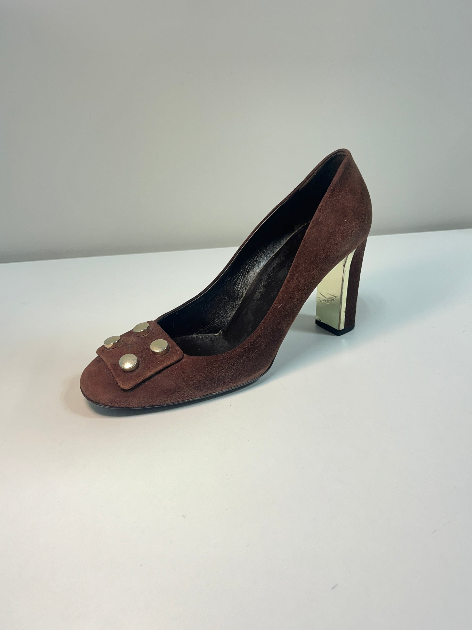 GUCCI by Tom Ford studded brown suede rounded toe pumps with golden detailing, some scratches but not really visible when worn