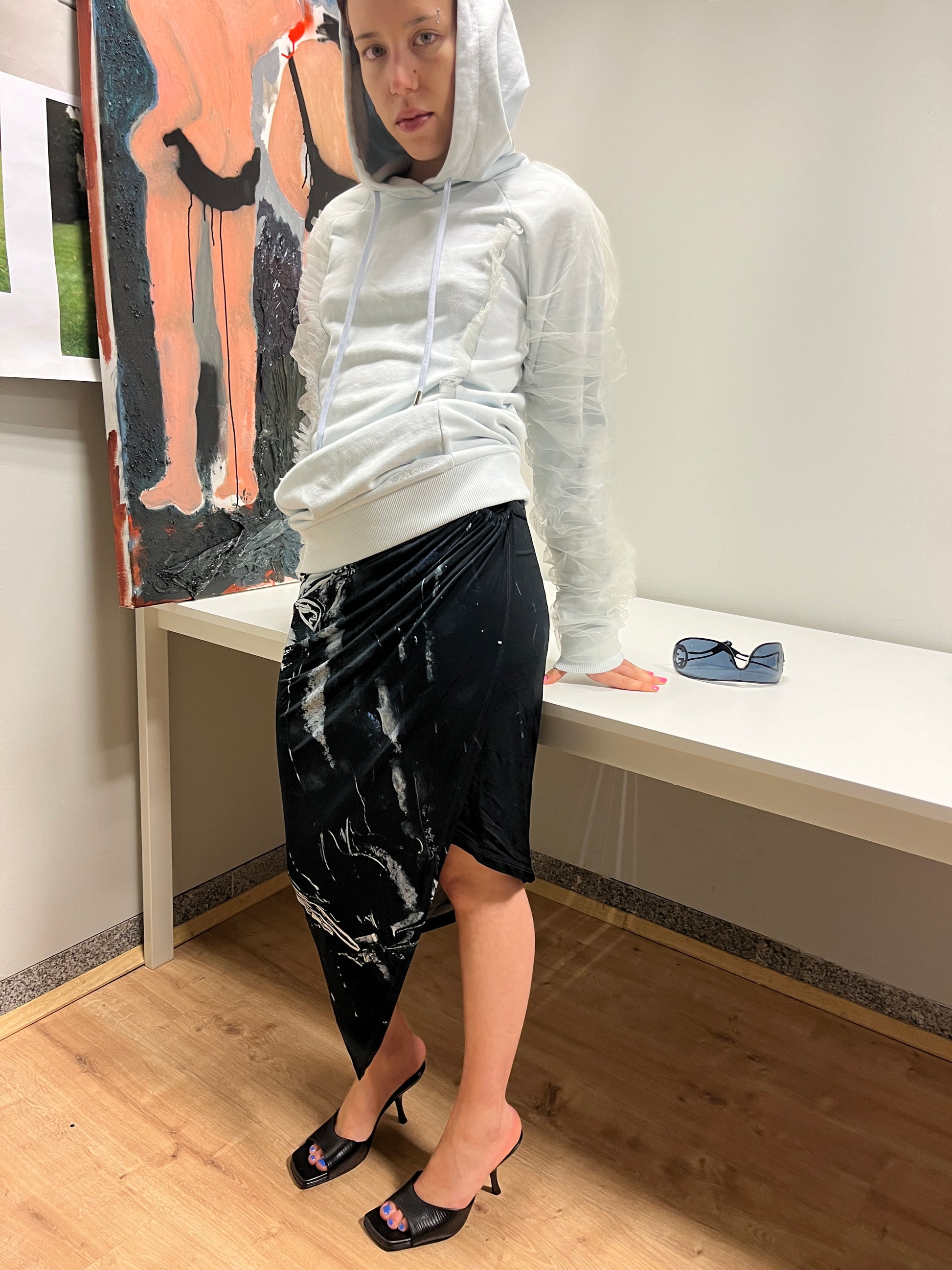 LOUISA BALLOU abstract black-grey print asymmetrical draped midi skirt with golden hoop