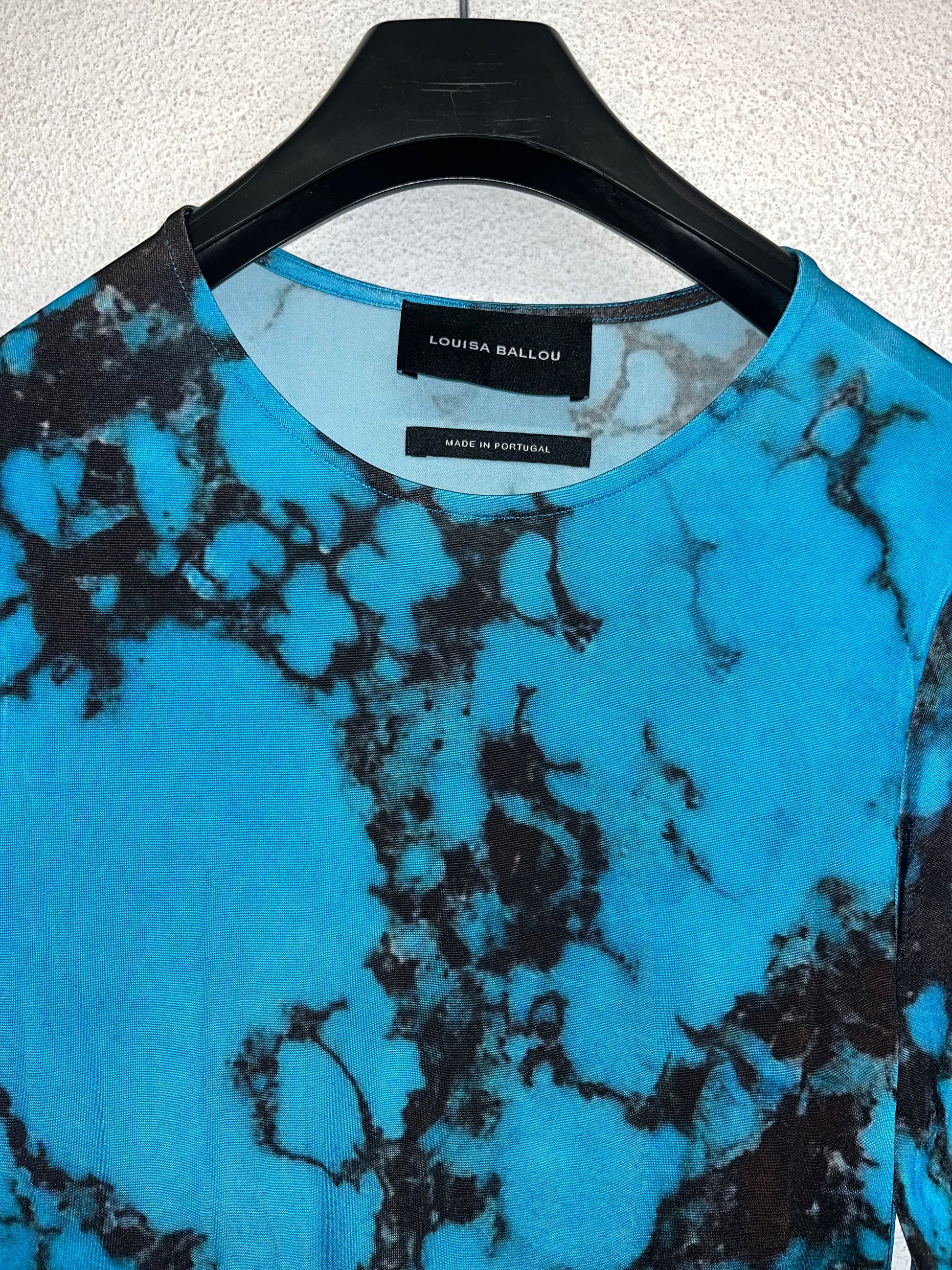 LOUISA BALLOU blue marble longsleeve maxi dress. Stretchy fabric