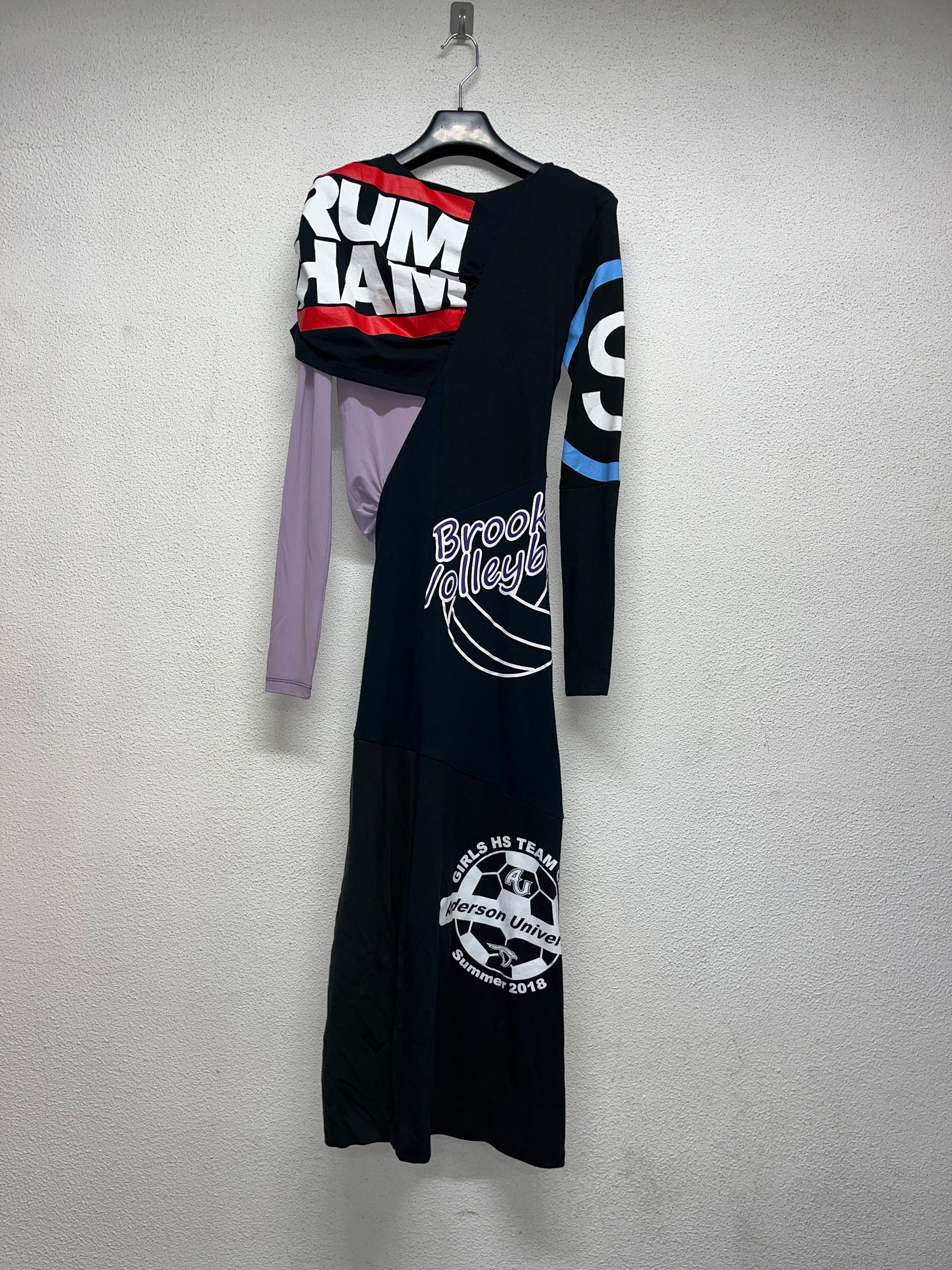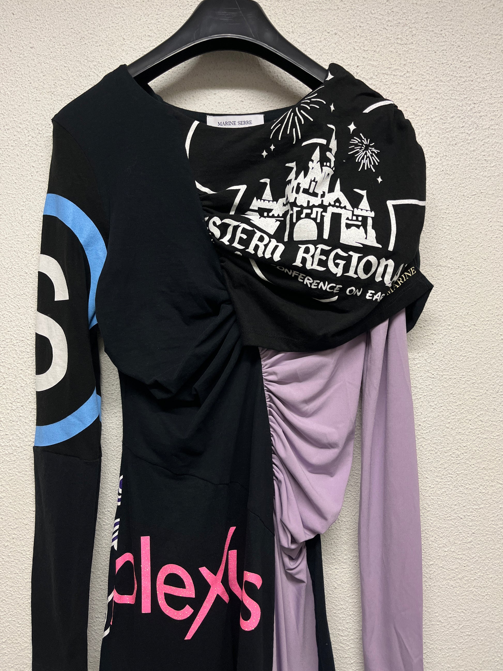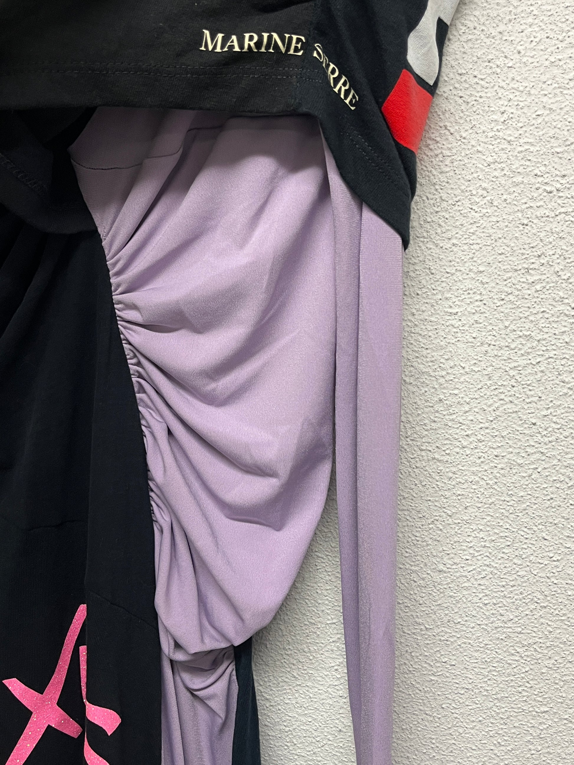 MARINE SERRE regenerated graphic maxi black dress with asymmetrical lilac quilted fabric