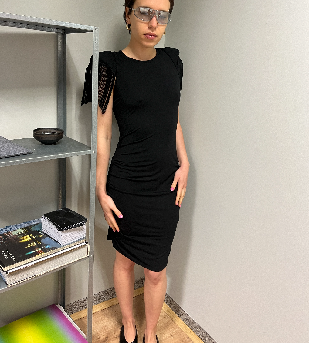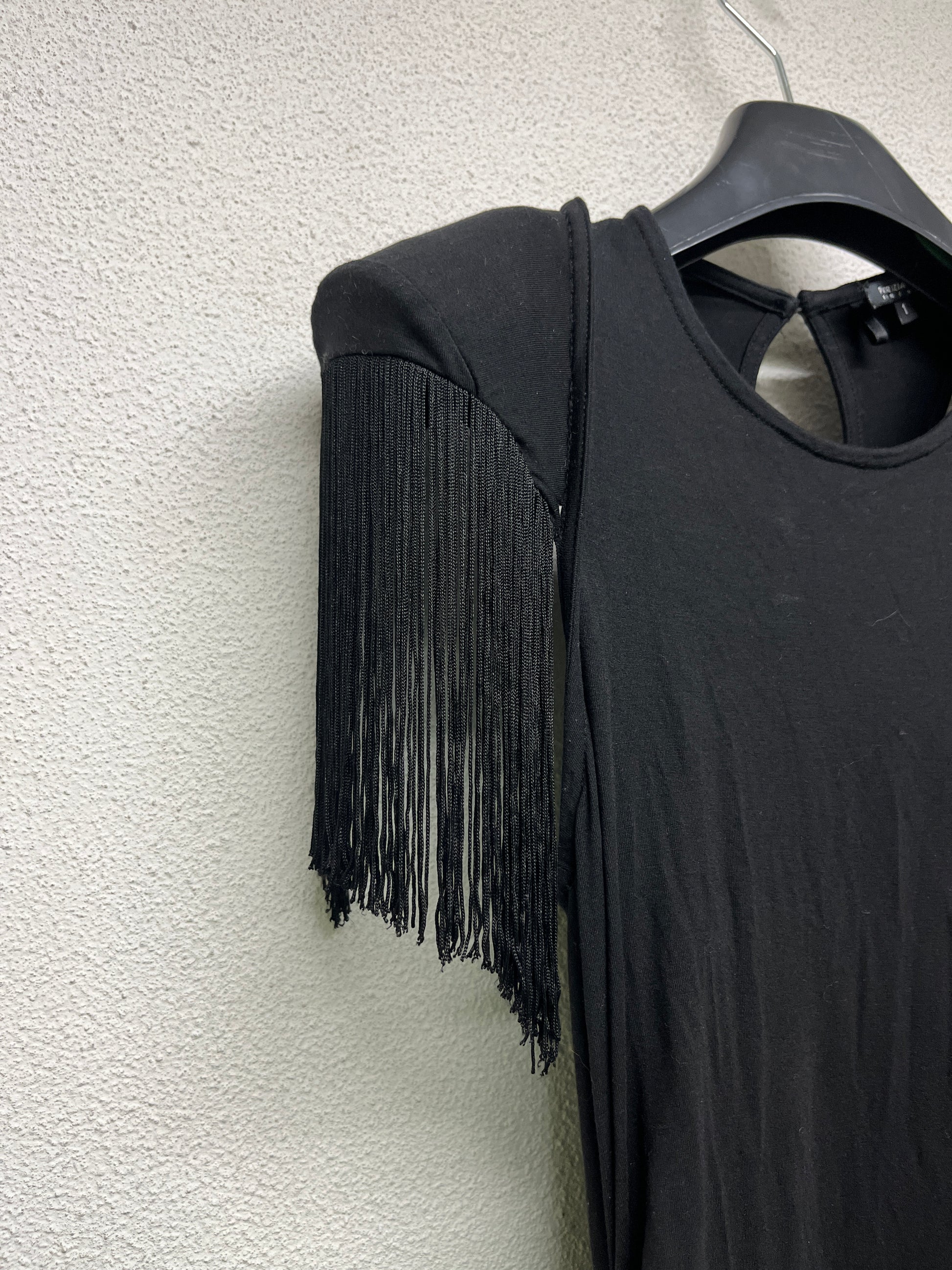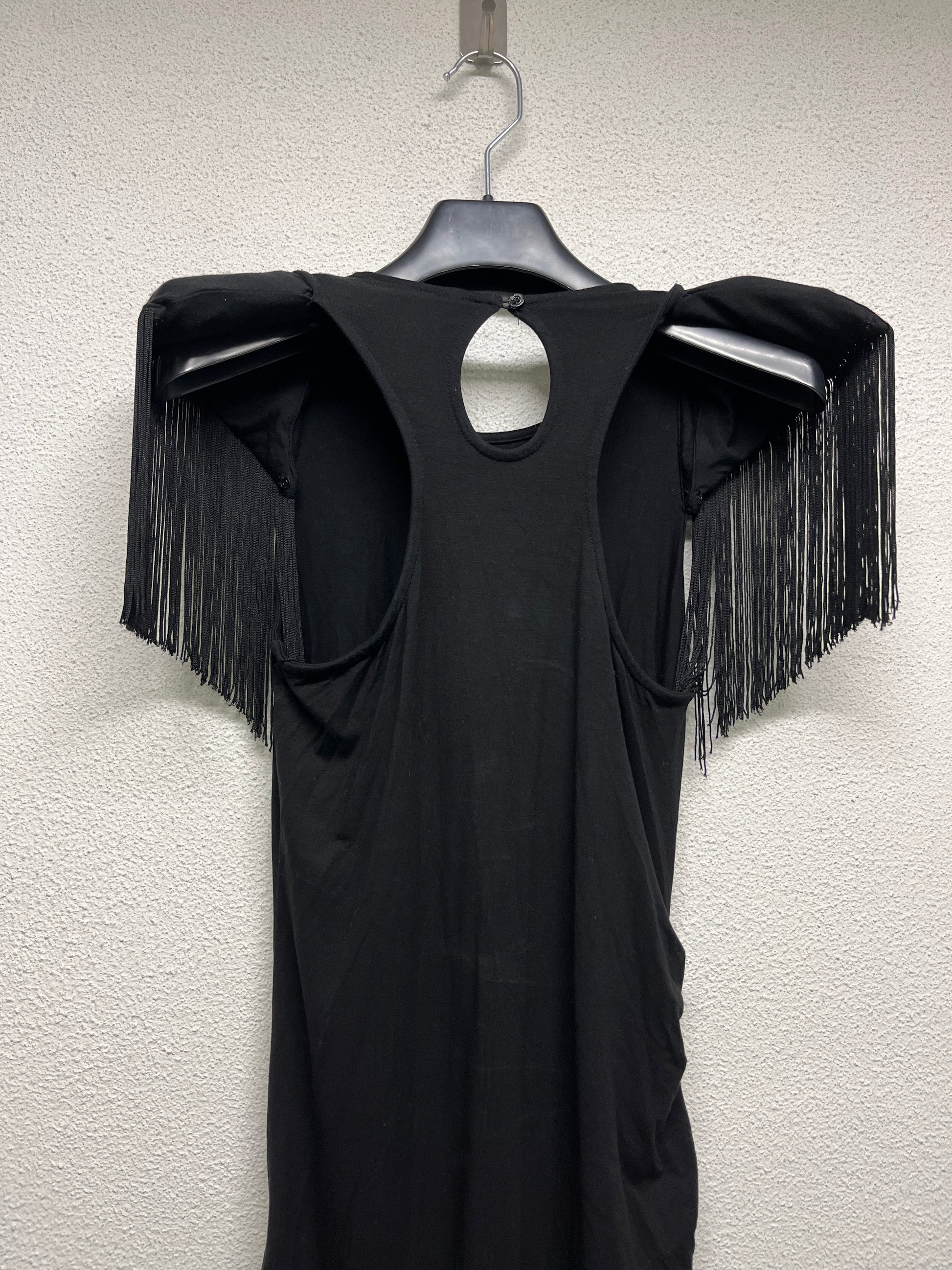PATRIZIA PEPE black viscose dress with shoulder fringes and pads, very stretchy