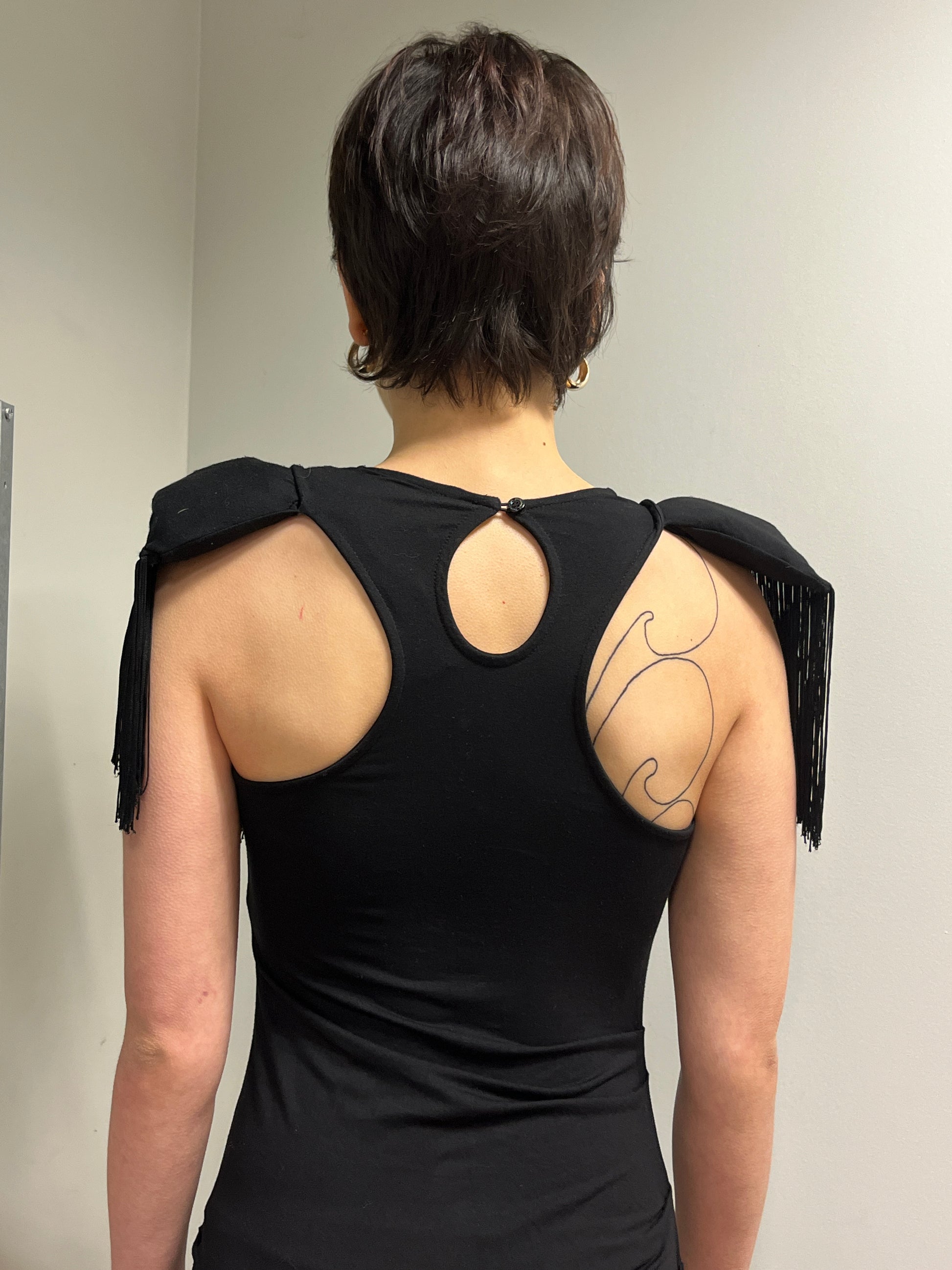 PATRIZIA PEPE black viscose dress with shoulder fringes and pads (XS/S)