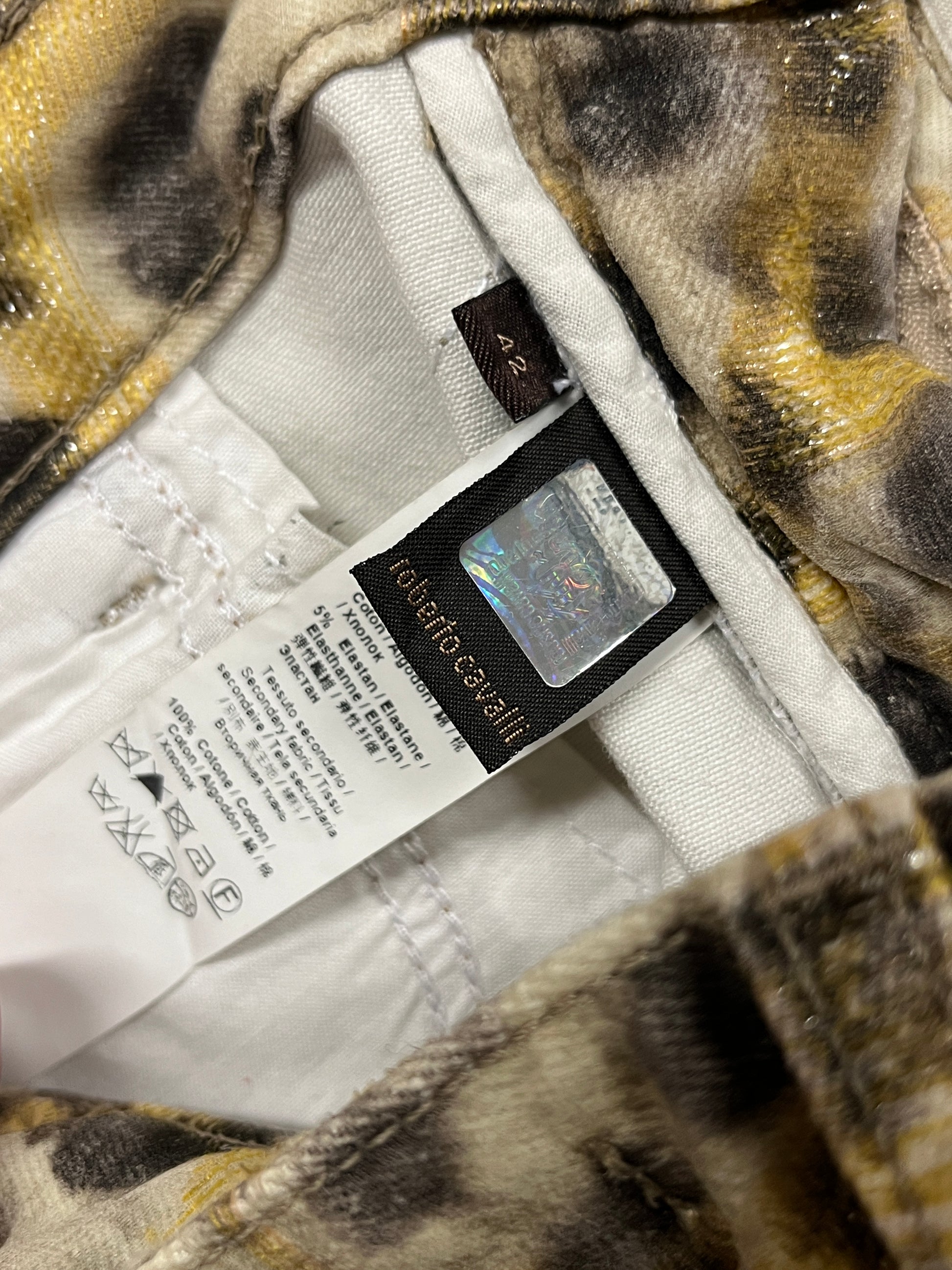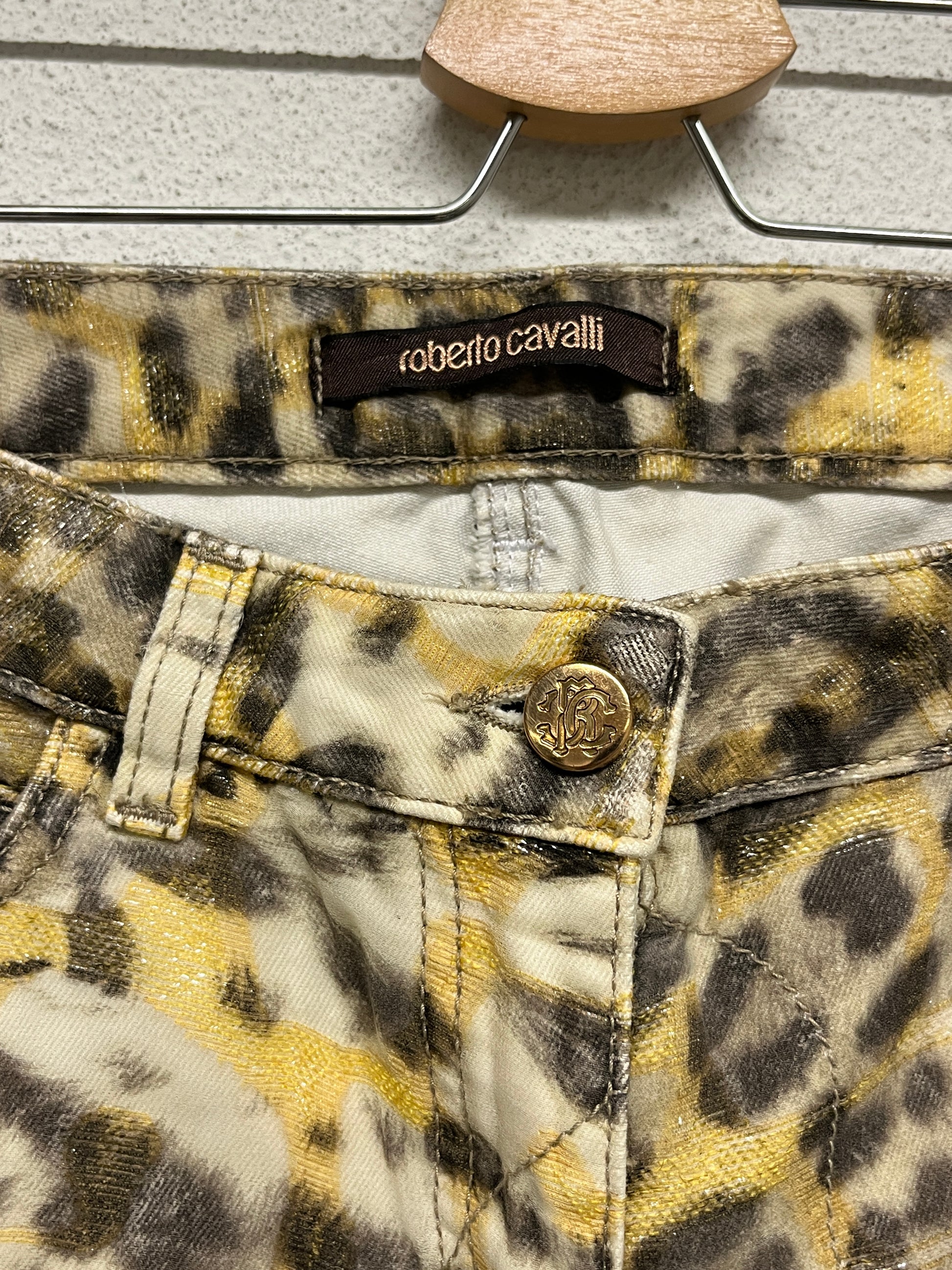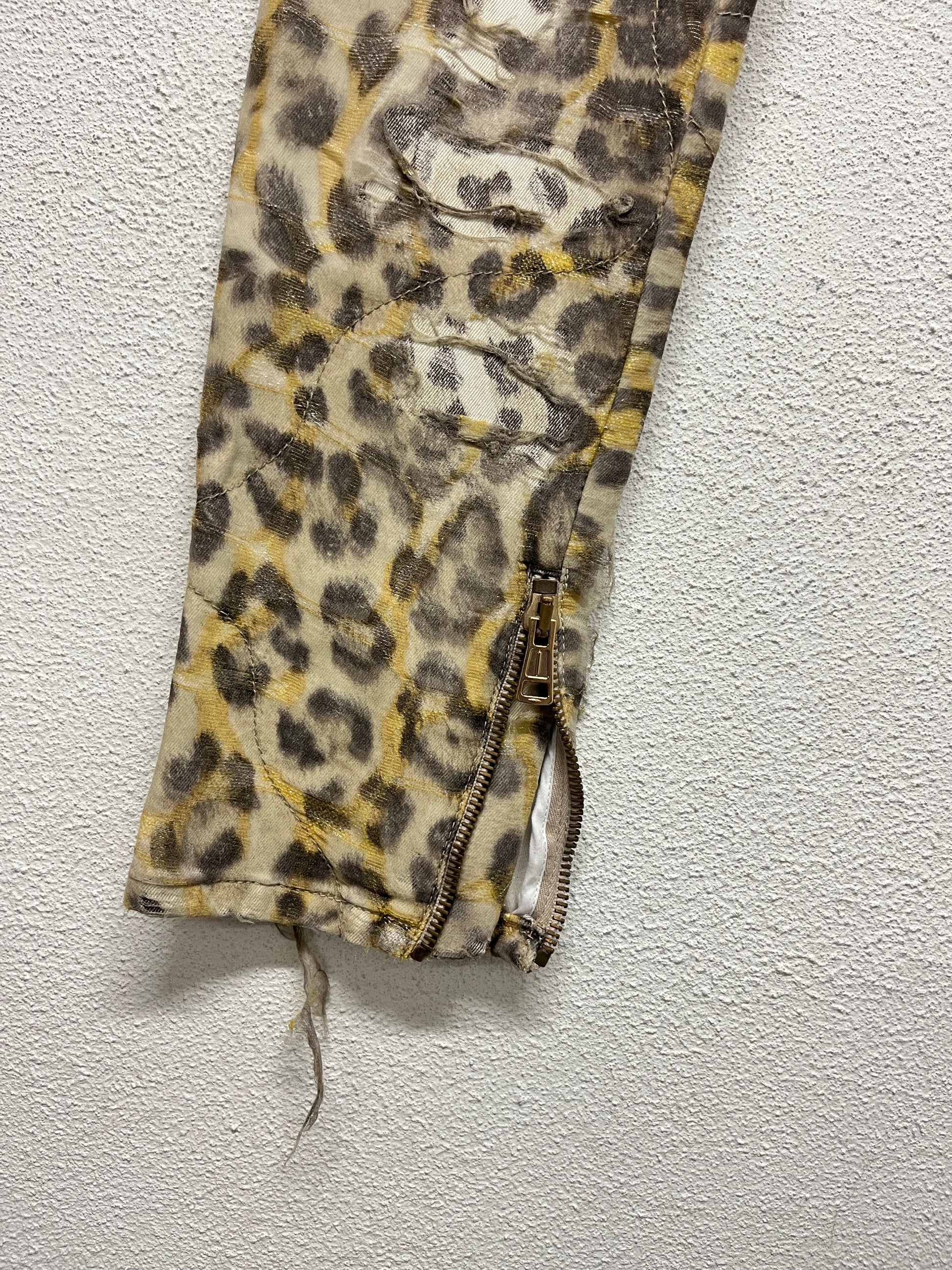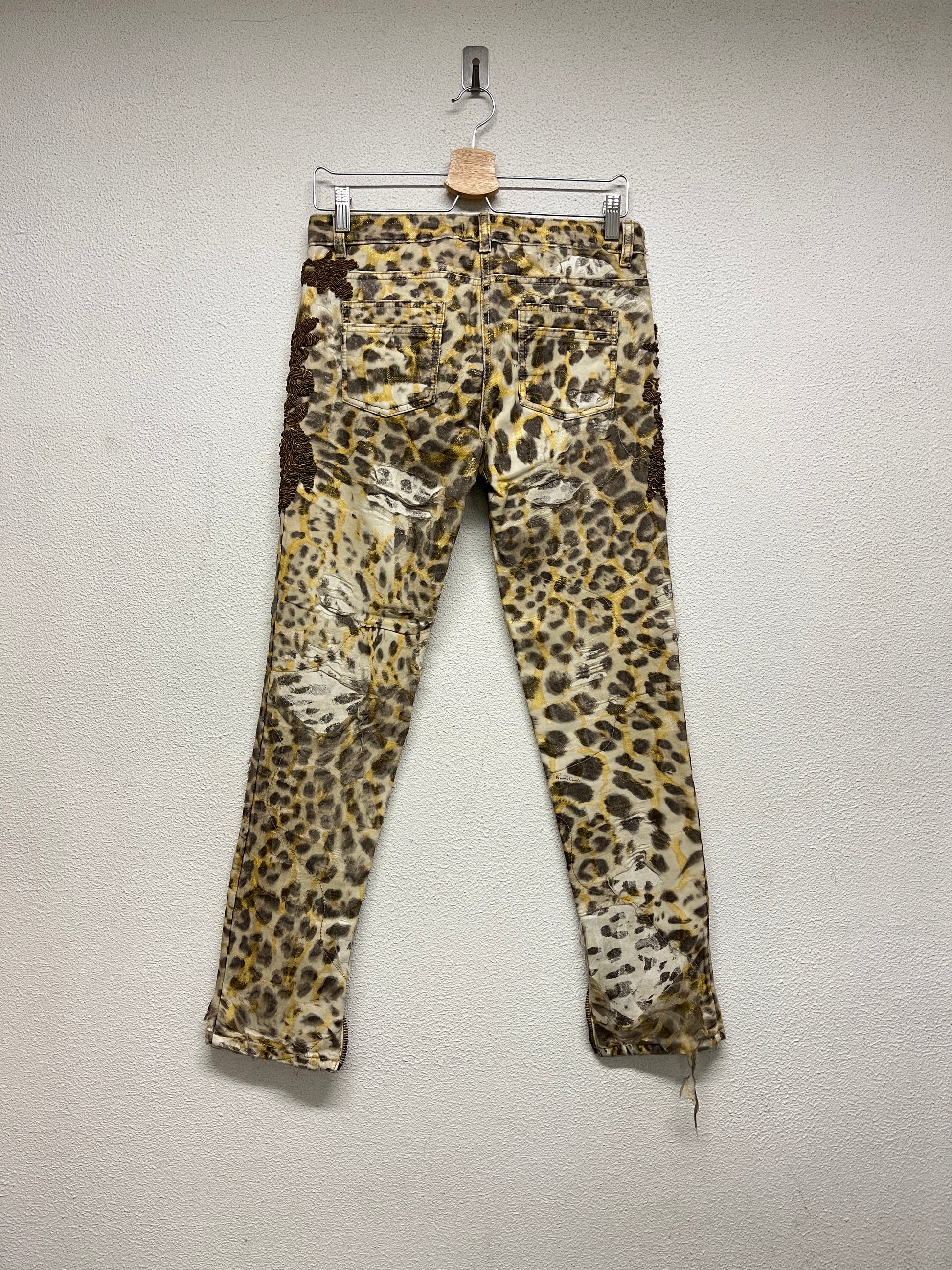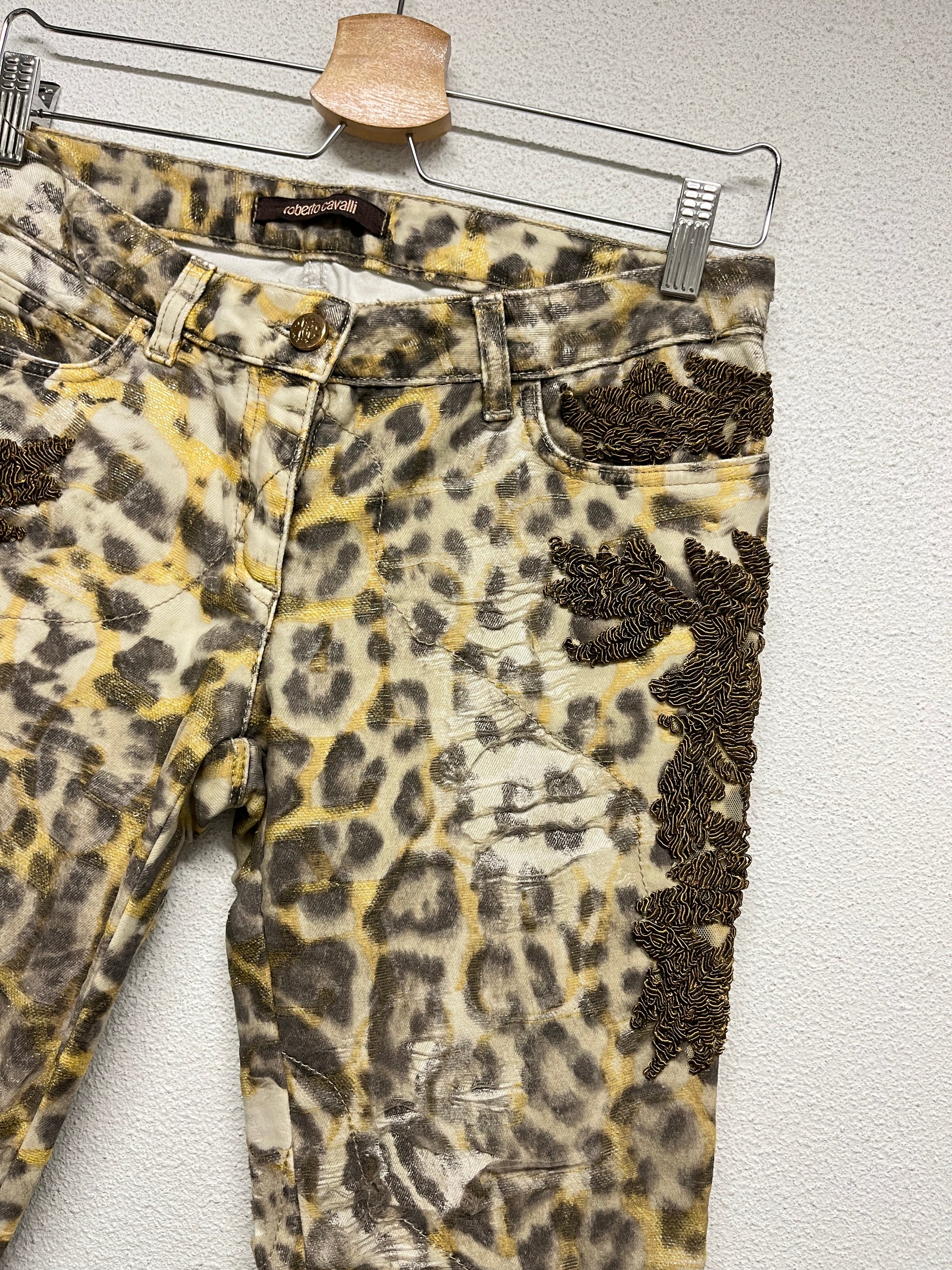 ROBERTO CAVALLI cotton leopard print distressed sheer slim fit with bead detailing trousers (M)