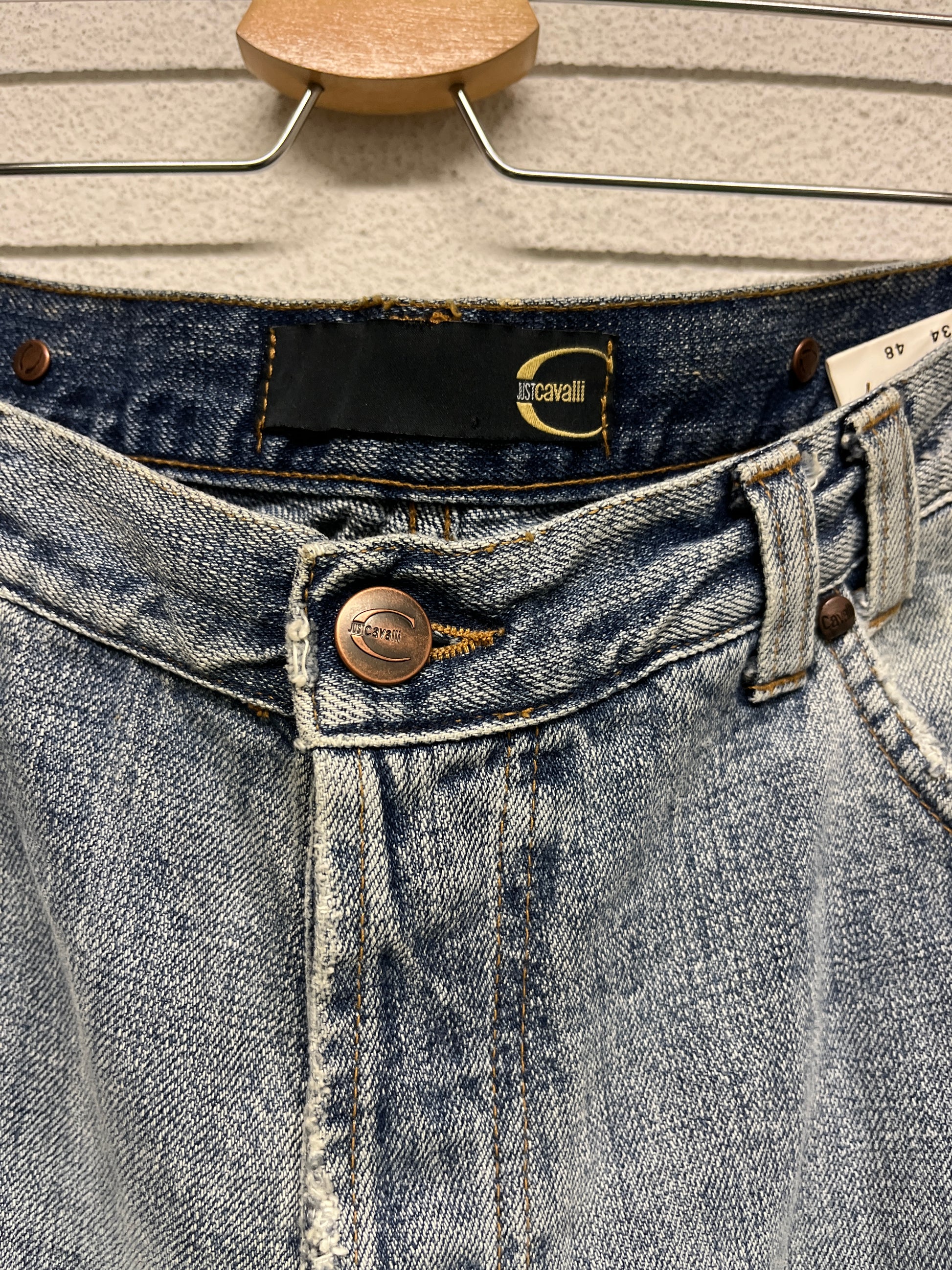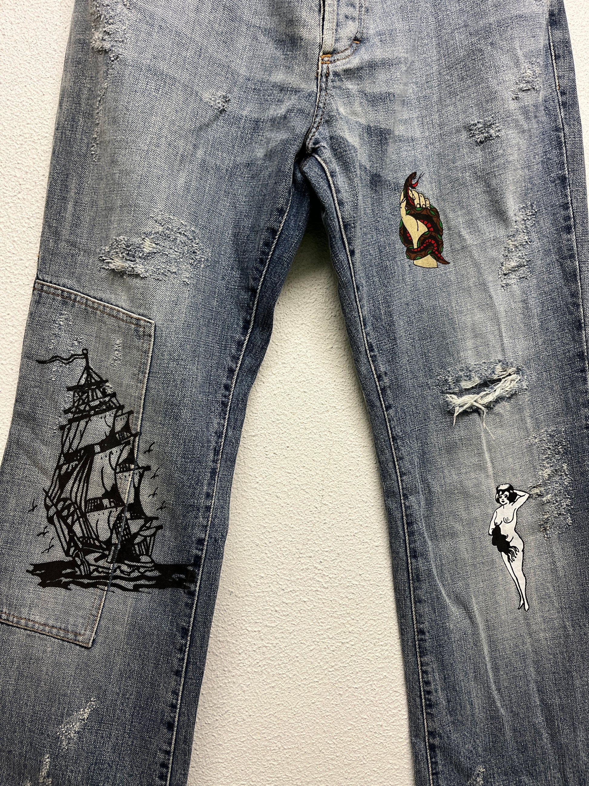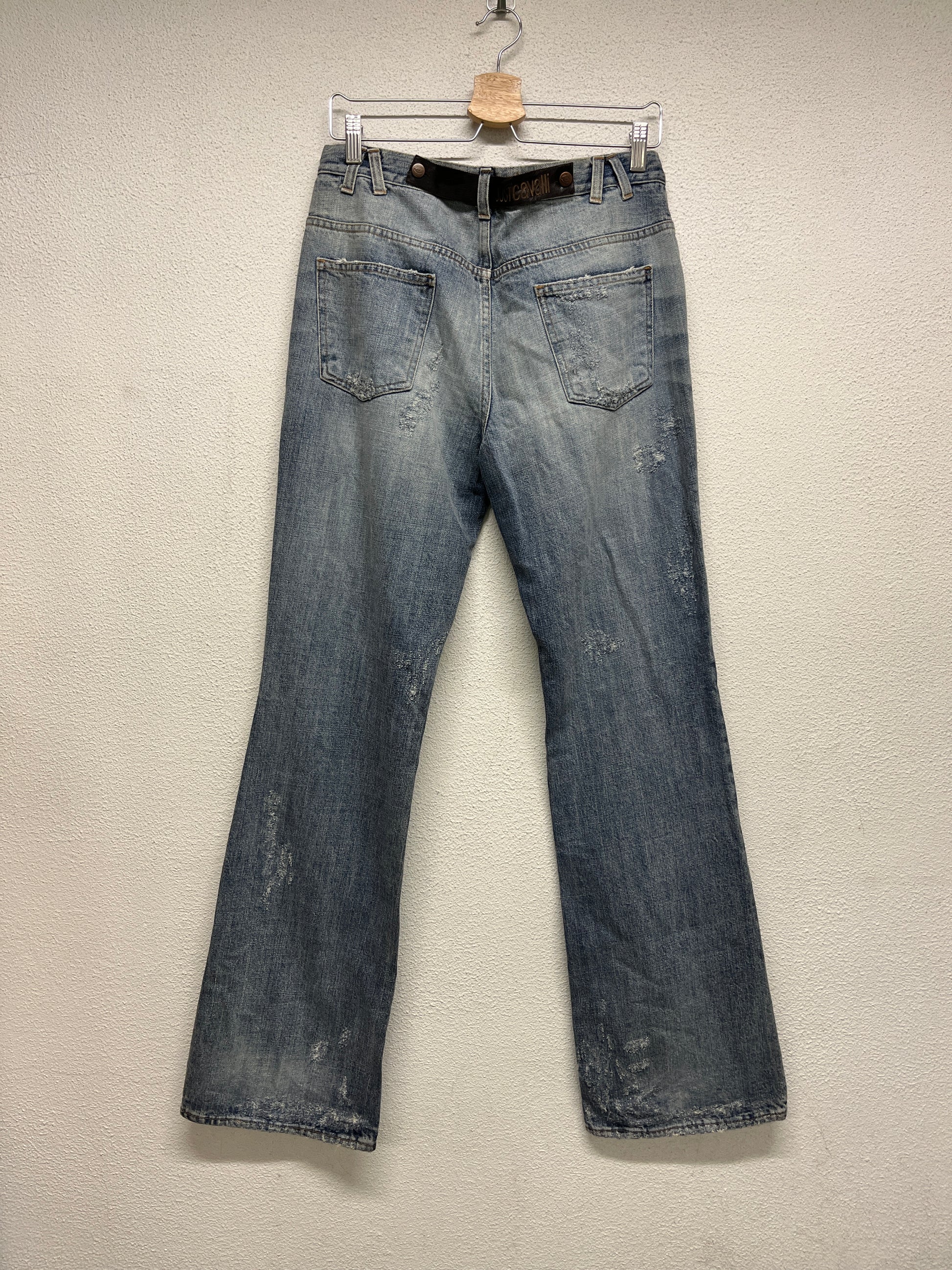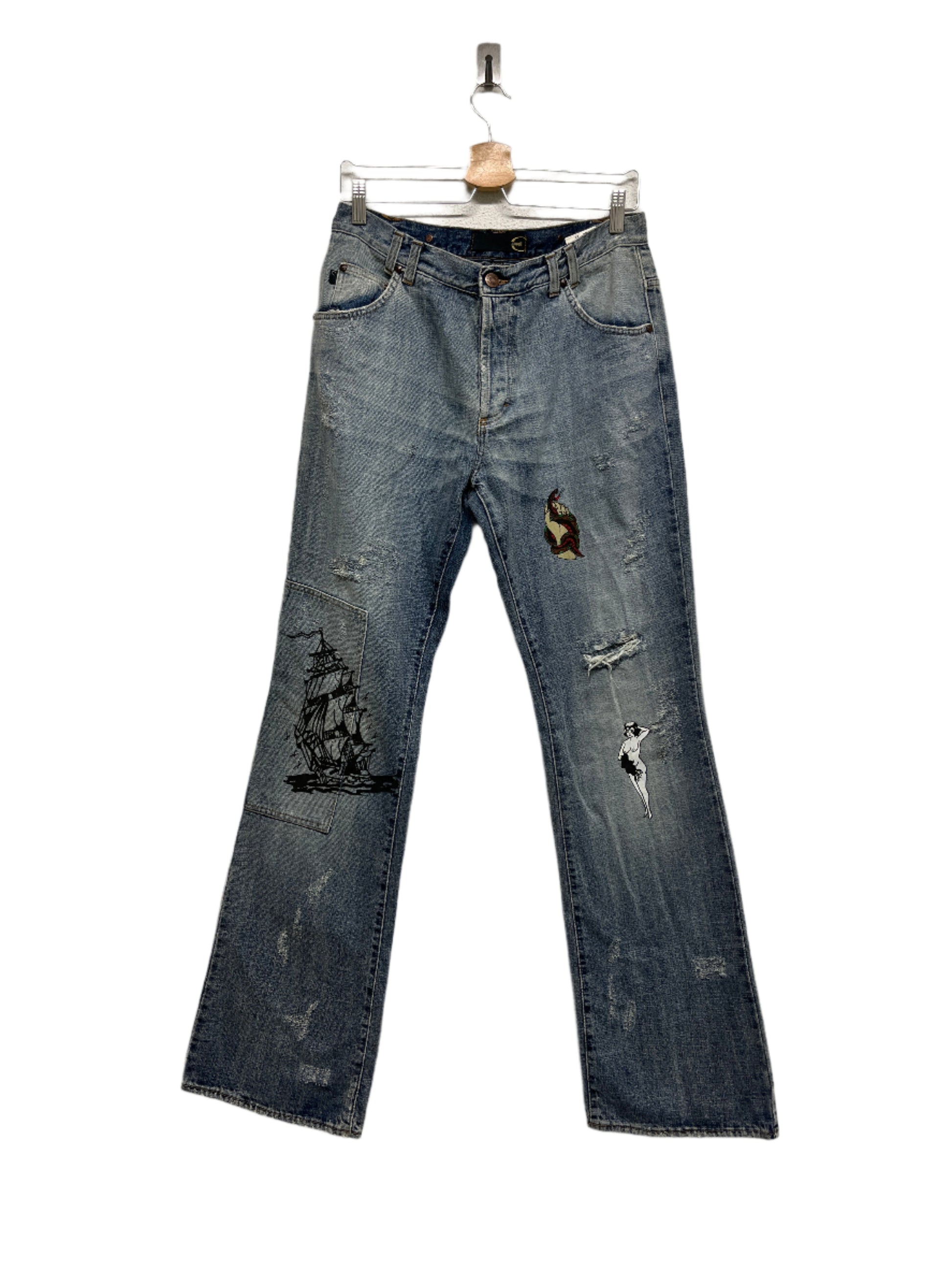 ROBERTO CAVALLI just cavalli tattoo graphic distressed denim bootcut trousers (M)