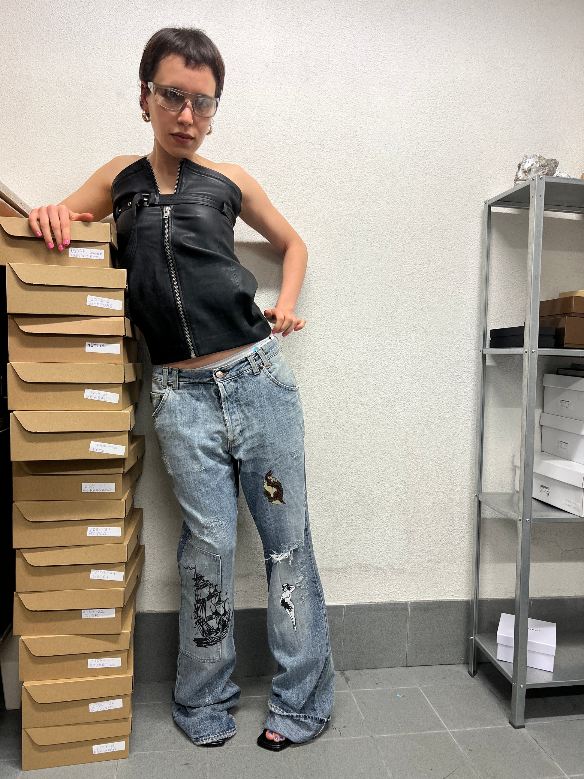 Model is 162cm and wears S/M, jeans have been adjusted in the waist