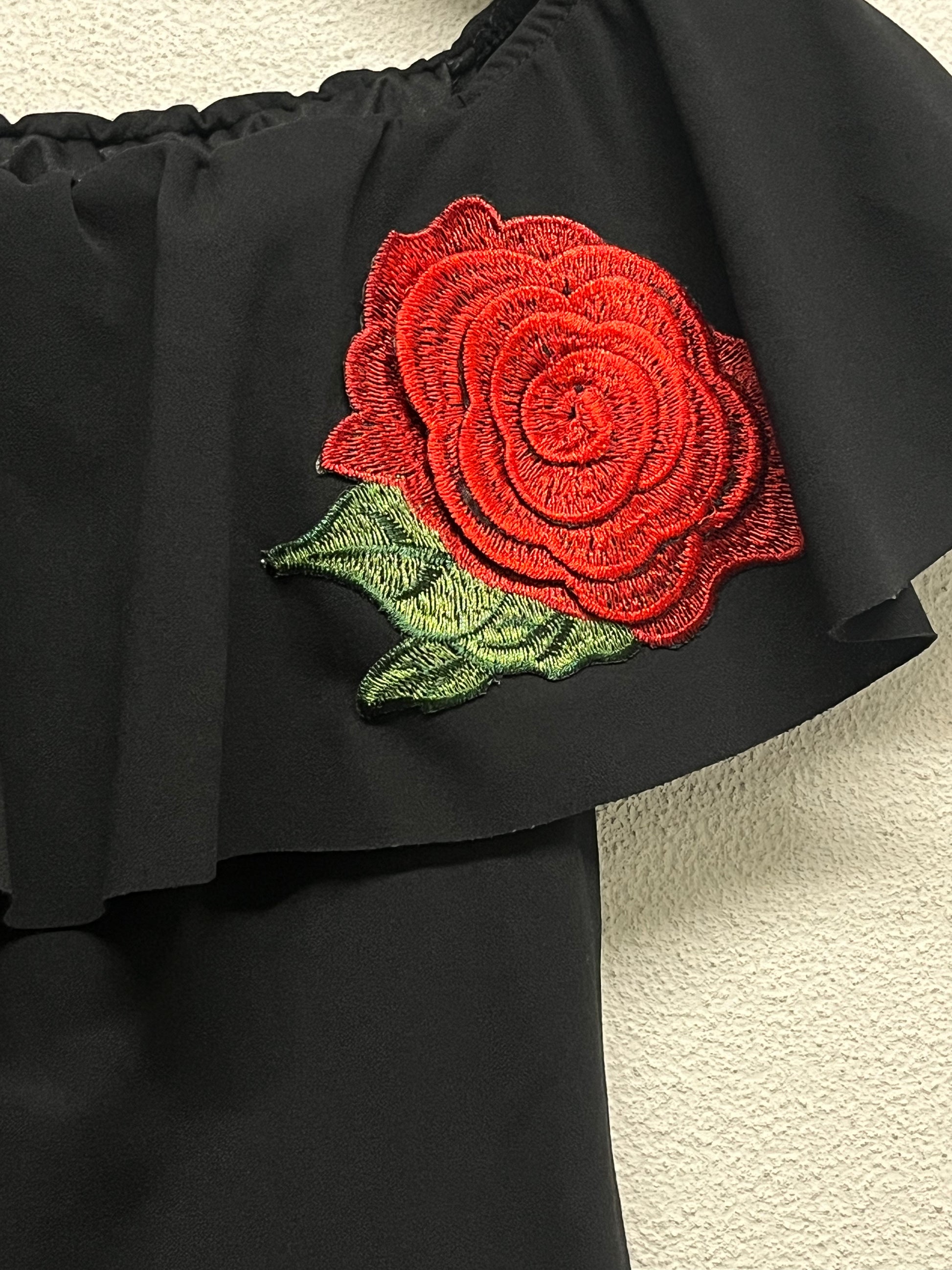 VINTAGE 2000s black double layer low shoulder chic top with rose patch