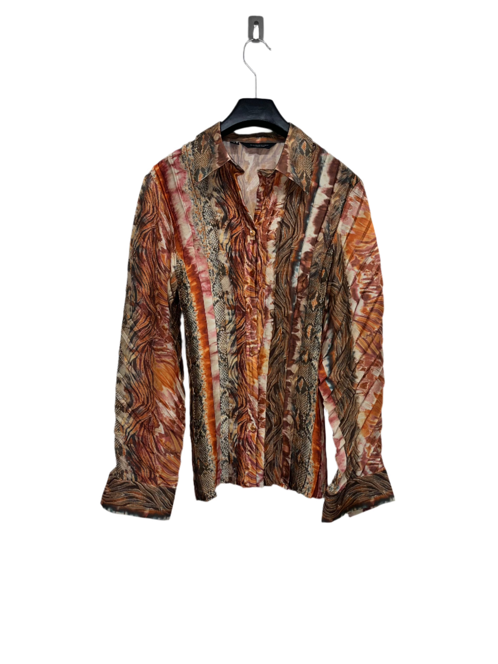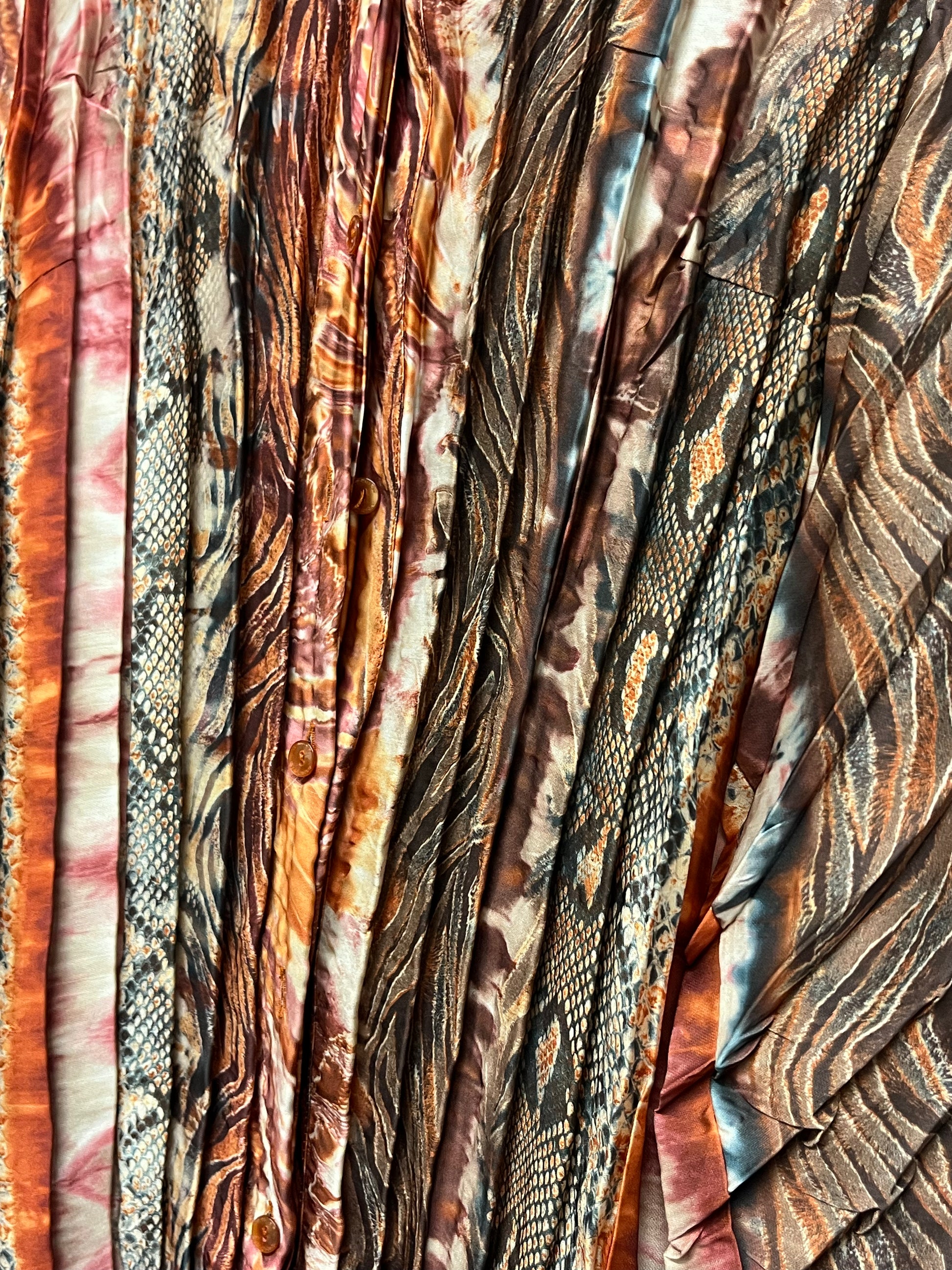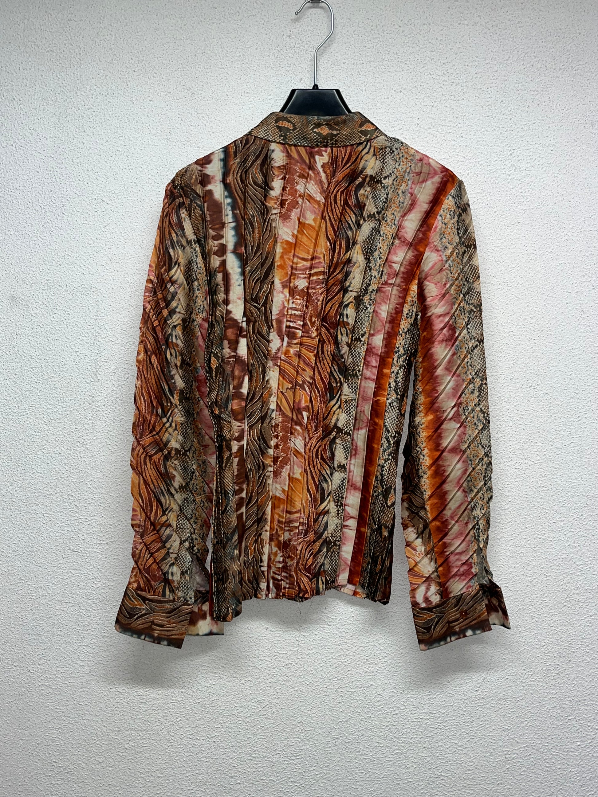 VINTAGE multi-pattern orange pleated ('pleats please') button up silk shirt