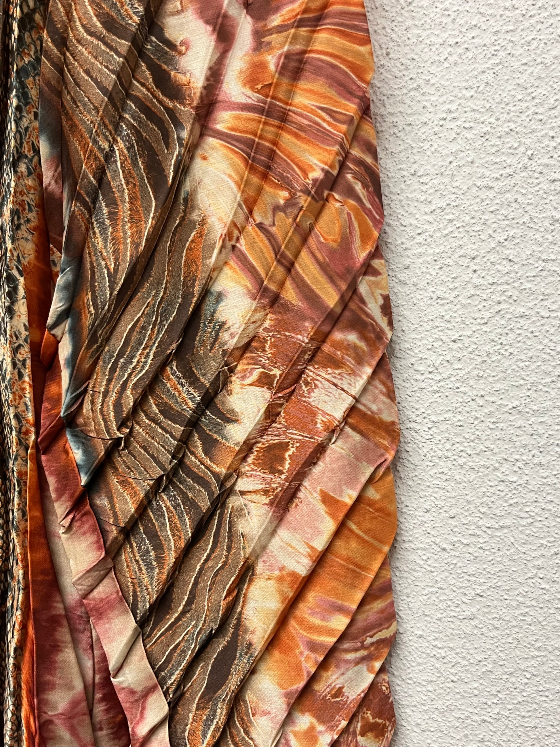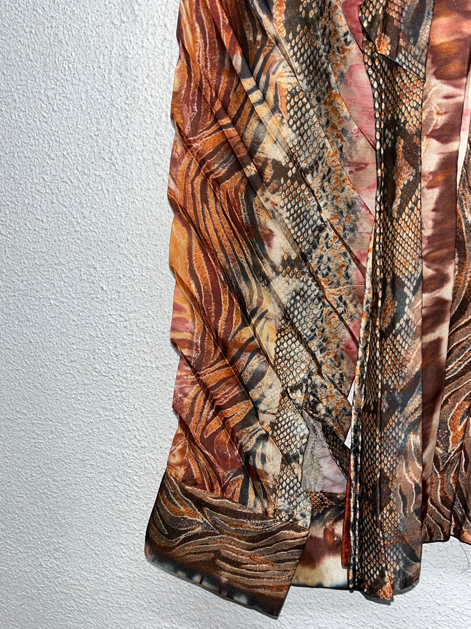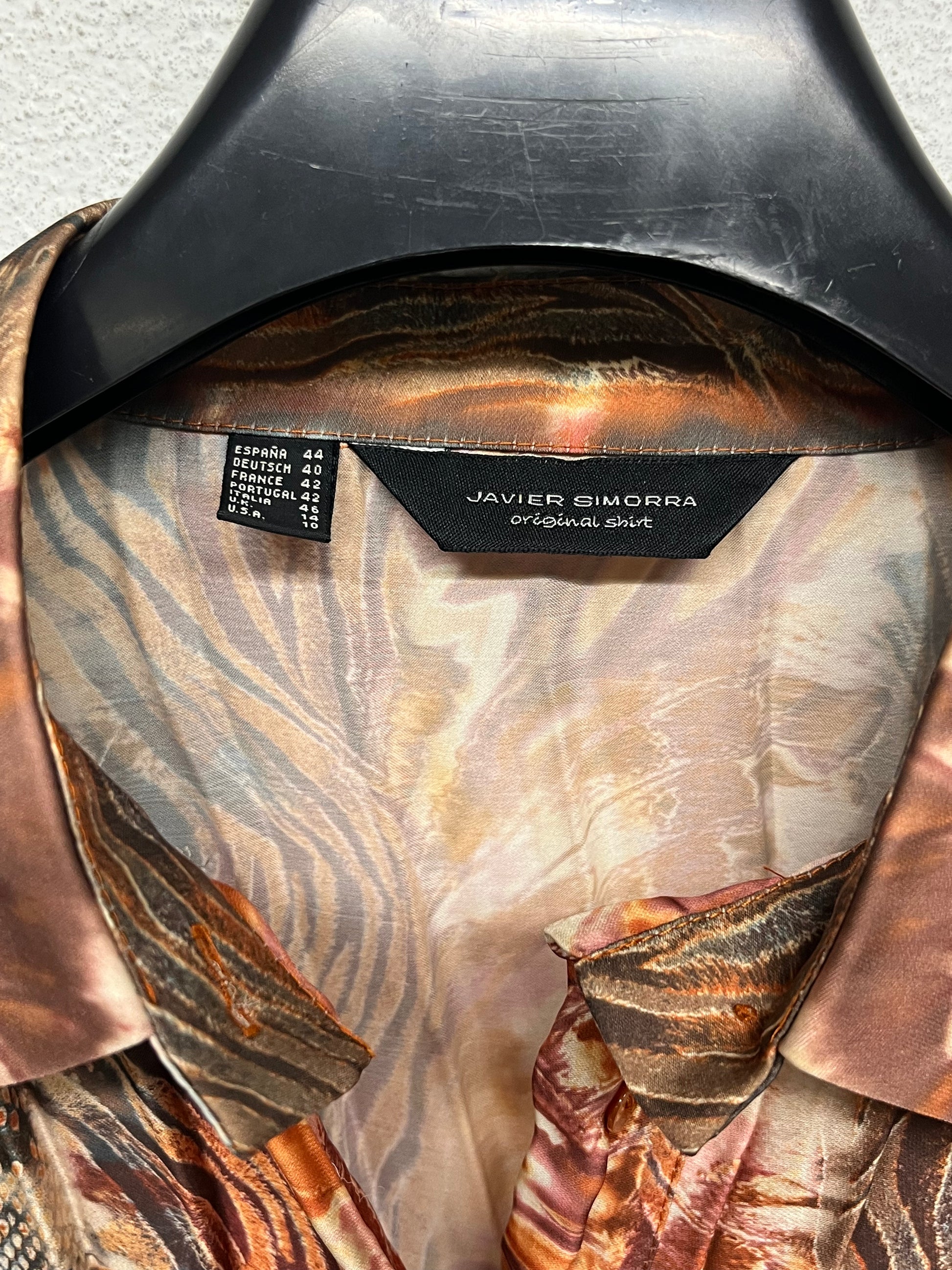 VINTAGE multi-pattern orange pleated ('pleats please') button up silk shirt